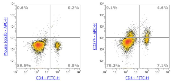 图 - 人 PBMC 经 PHA 刺激 3 天后,染色 Anti-Human CD4, FITC 和 Mouse IgG2b Isotype Control, APC (右) 和 Anti-Human CD4, FITC 和 Anti--Human CD274, APC(Clone: 29E.2A3)(左)的结果。
