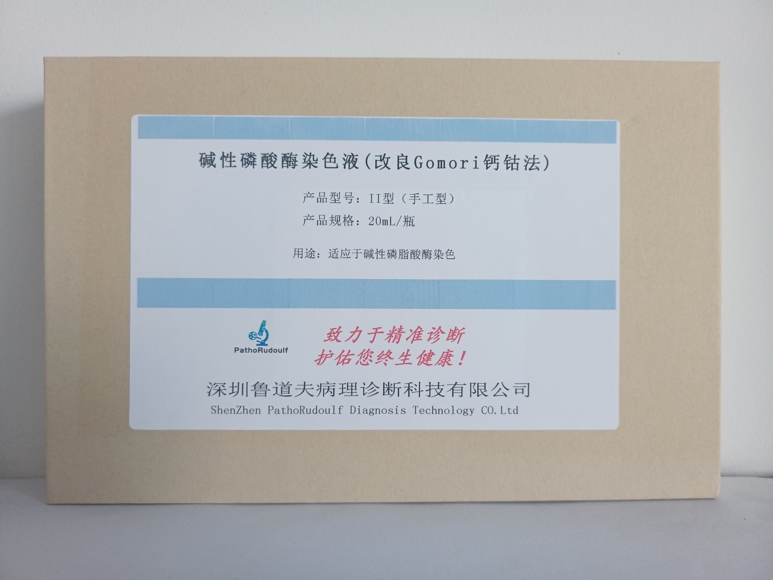 碱性磷酸酶染色液(改良Gomori钙钴法)采用金属沉淀法来显示碱性磷酸酶活性,此法以天然存在的β-甘油磷酸钠为底物,经酶水解释放出磷酸,磷酸根与钙离子结合为磷酸钙沉淀,再依次被置换为磷酸钴和硫化钴,产物为黑色硫化钴沉淀。