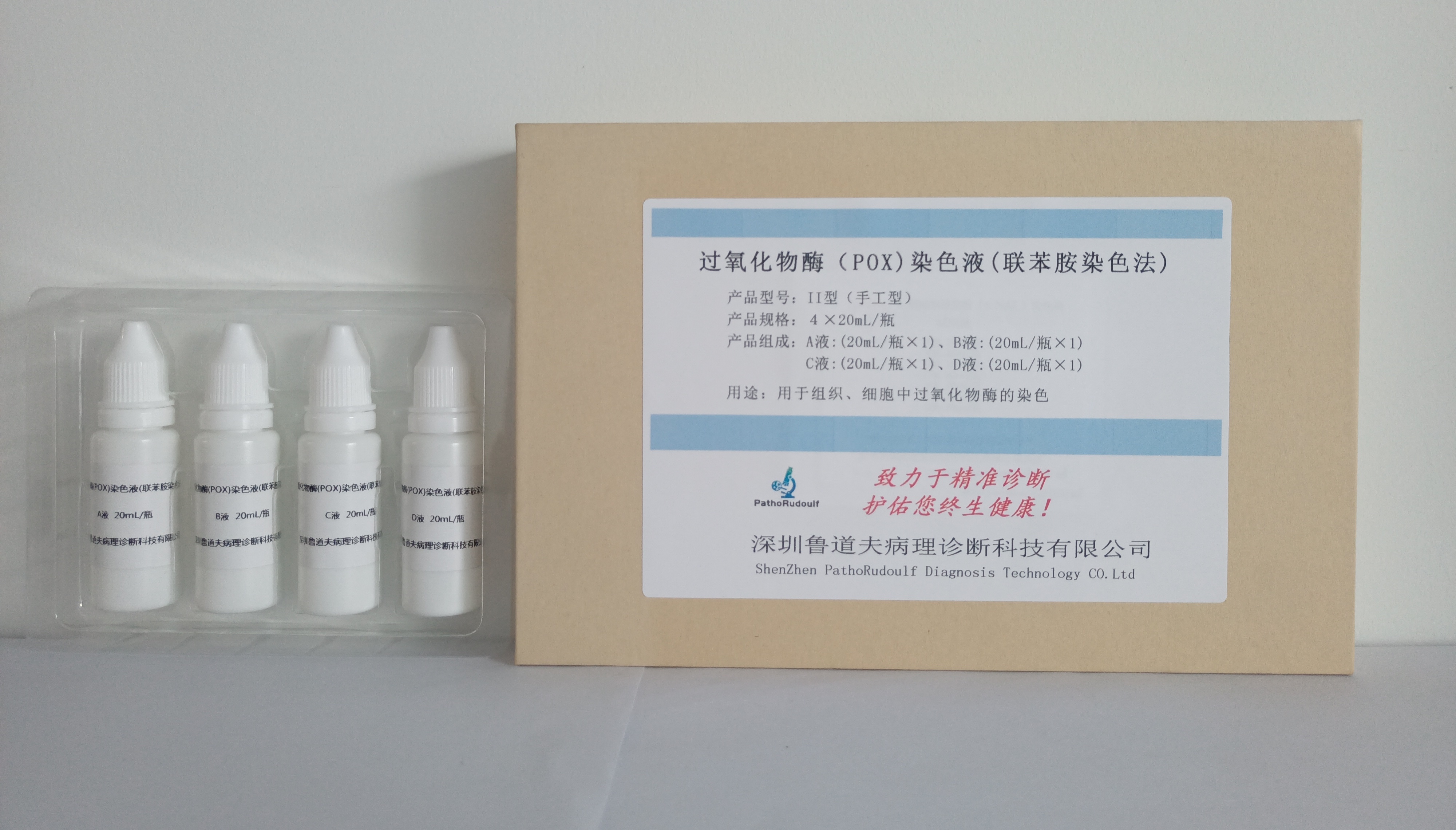 过氧化物酶(POX)染色液(联苯胺染色法)是ICSH推荐采用的POX染色液,其原理是细胞内的过氧化物酶能将无色的3,3-二氨基联苯胺(DAB)的氢原子传递给过氧化氢,使前者催化成有色染料沉积在细胞质中的POX所在部位。该染液可用于血液、骨髓或细胞涂片过氧化物酶染色, POX活性部位呈棕黄色。