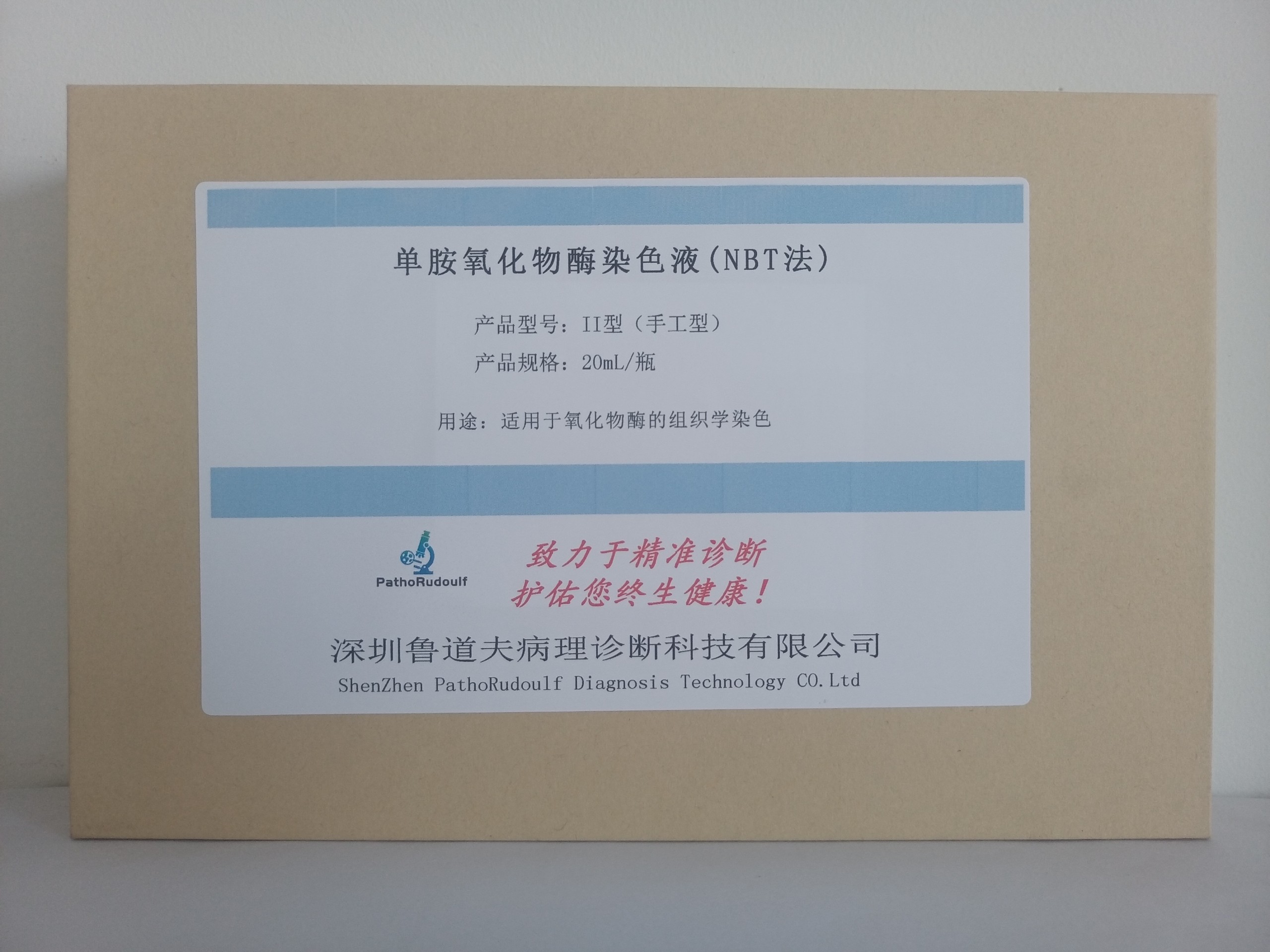 单胺氧化酶染色液(NBT法)是以色胺盐为底物,硝基四唑盐为氢受体,在氧化脱氨过程中,从色胺生成的3’吲哚乙醛使硝基四唑盐还原为甲臜沉淀。