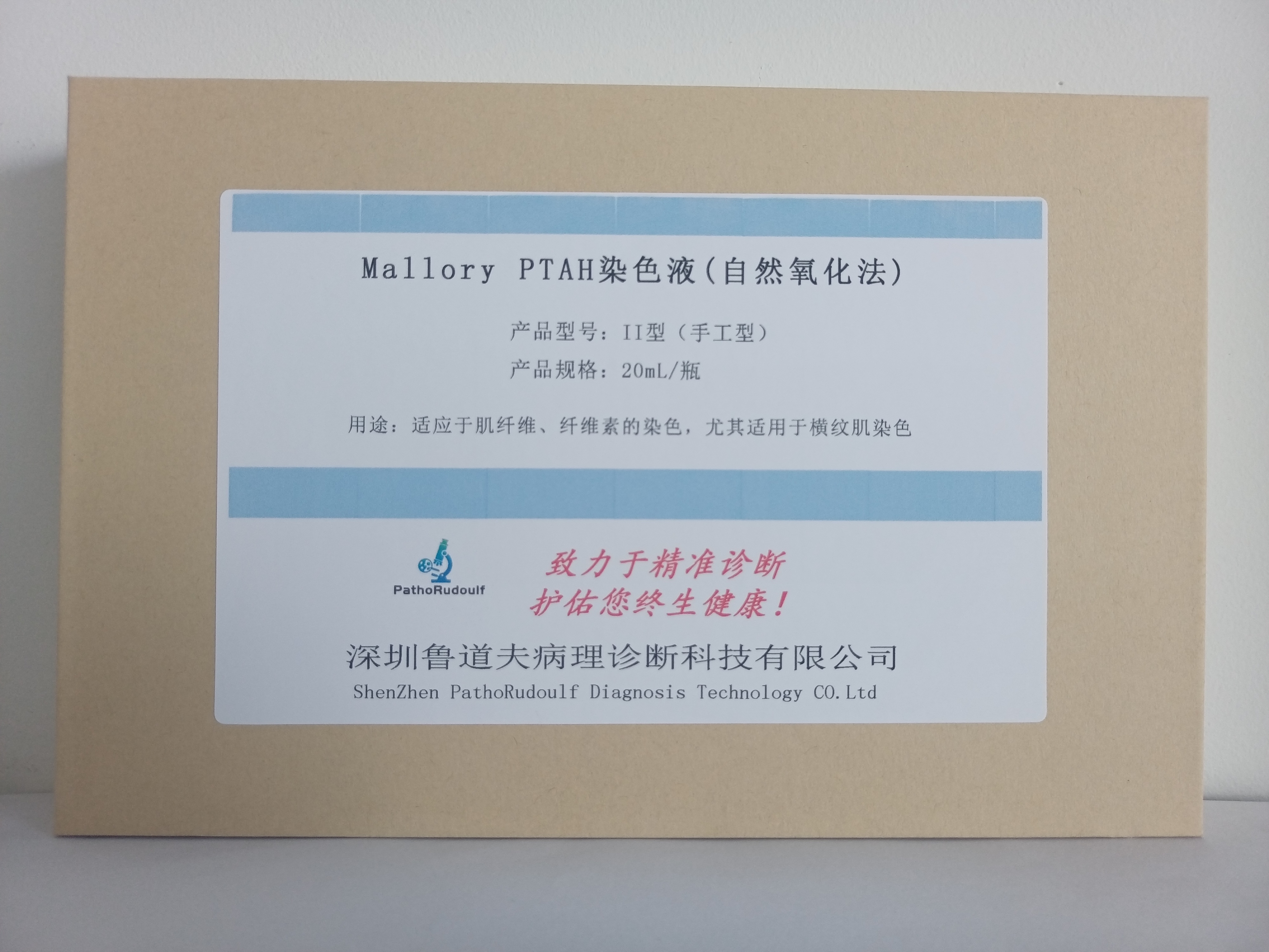 Mallory PTAH染色液(自然氧化法)又称Mallory磷钨酸苏木素染色液,为自然成熟的染液,染色力较好,保存时间长,多用于显示横纹肌的横纹,临床上应用该法对横纹肌肉瘤进行诊断,横纹肌肉瘤的组织学形态变化多样,与未分化的间胚叶肿瘤很难鉴别;采用磷钨酸苏木素染色后,如果在瘤细胞胞质内发现蓝色横纹,则可以证明该肿瘤是呈横纹肌分化;该染色液也可以对炎症渗出的纤维素、DIC的毛细血管中纤维素以及神经病理等方面进行染色。