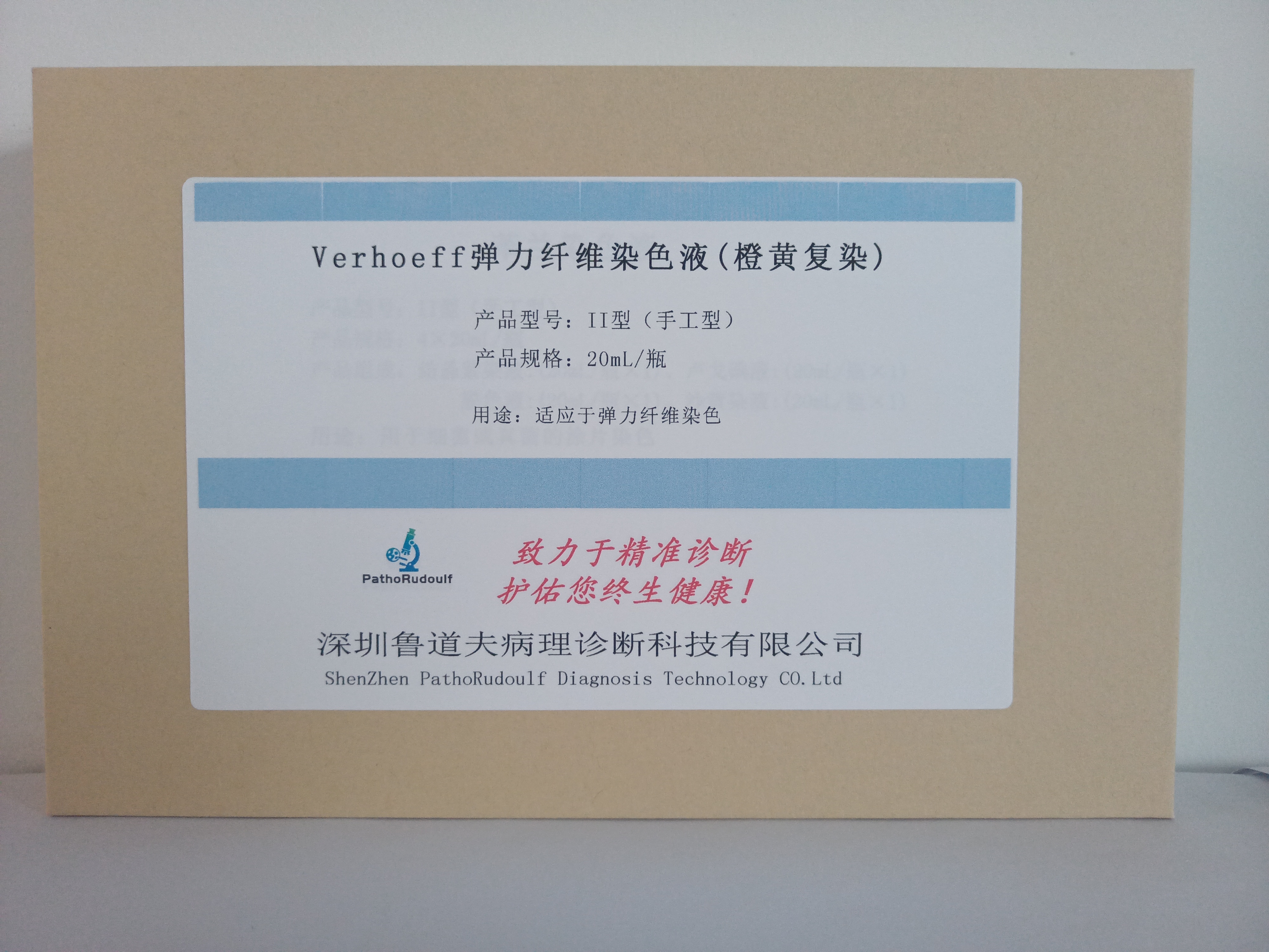 Verhoeff弹力纤维染色液(橙黄复染)属于铁碘苏木素染色法,其染色原理是弹力蛋白与前弹力蛋白纤维可通过二硫键高度交联,经碘氧化后,部分二硫键转化为阴离子的硫酸衍生物,该衍生物呈强嗜碱性,对染液中的碱性染料苏木素有选择性吸收。本产品采用改良的橙黄G复染法,染色后粗纤维着色较深,细纤维染色效果稍差,细胞核和弹力纤维呈(蓝)黑色,其他组织呈紫红色,对比清晰。