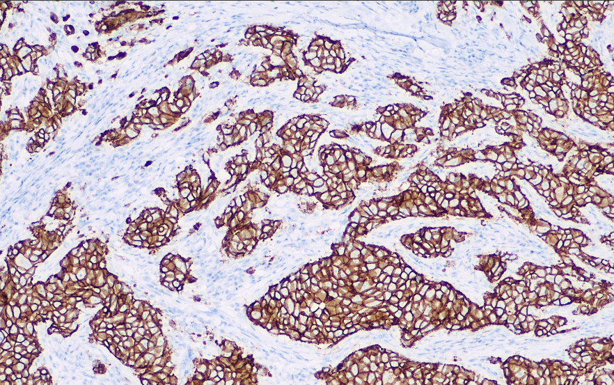 E-Cadherin是一种在上皮细胞中表达的粘附蛋白。在腺上皮以及肺、胃肠道腺癌和卵巢中存在表达。可用于区分腺癌(+)和间皮瘤(-),乳腺导管癌(+)和乳腺小叶癌(-),在一些甲状腺癌中呈阳性。E-Cadherin在乳腺癌和非小细胞肺癌中的表达下降或缺失,常作为预后不良的标志。目前主要用于各种恶性肿瘤细胞的侵袭和转移的研究,是肿瘤进展、预后的重要标记物之一。