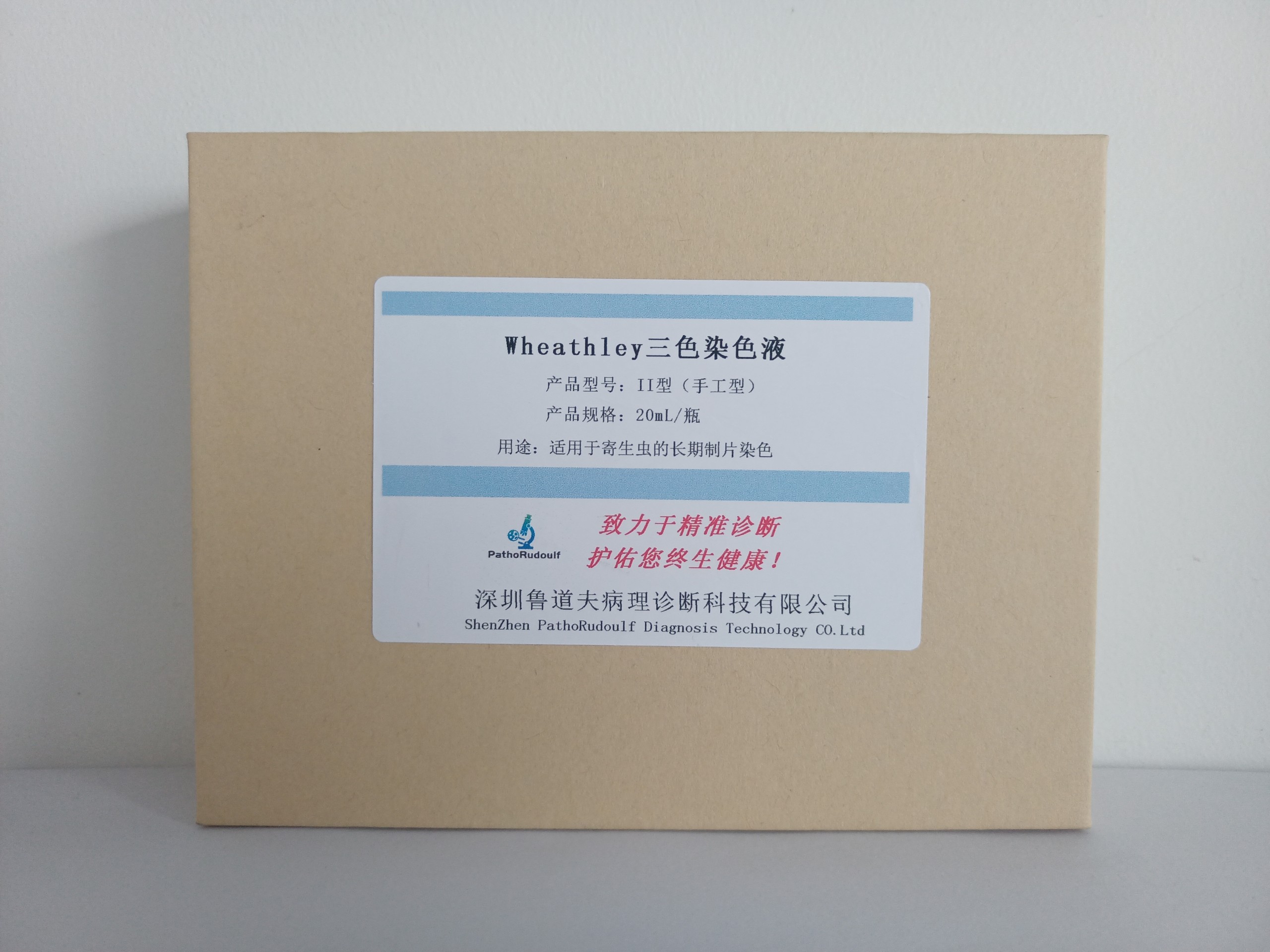 Wheathley三色染色液即Wheatley Trichrome Stain,又称作惠特利三色染色液,初期由Gomori开发并用于染色组织切片和细胞涂片。1951年,Wheatley通过添加固定和脱水过程改进了Gomori的技术,形成了一种简单、快速的肠道变形虫和鞭毛虫染色程序。Chromotrope 2R可将核染色质、染色质、核体、寄生虫卵和幼虫、细菌以及吞噬的红细胞染为红紫色;淡绿或固绿染料可将包囊、滋养体和其他细胞成分的细胞质染成蓝绿色。本产品常用于从粪便样本中检测、鉴定和区分肠道原生动物与背景材料。