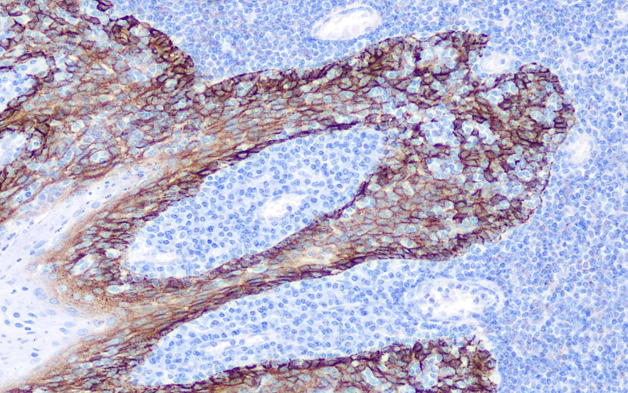 EGFR是一种分子量为170kD的膜蛋白。EGFR表达于多种正常组织,特别是复层上皮和鳞状上皮的基底层。EGFR过表达预示乳腺癌及胃癌预后差。并可指导治疗结直肠癌的靶向药物西妥昔单抗的应用。