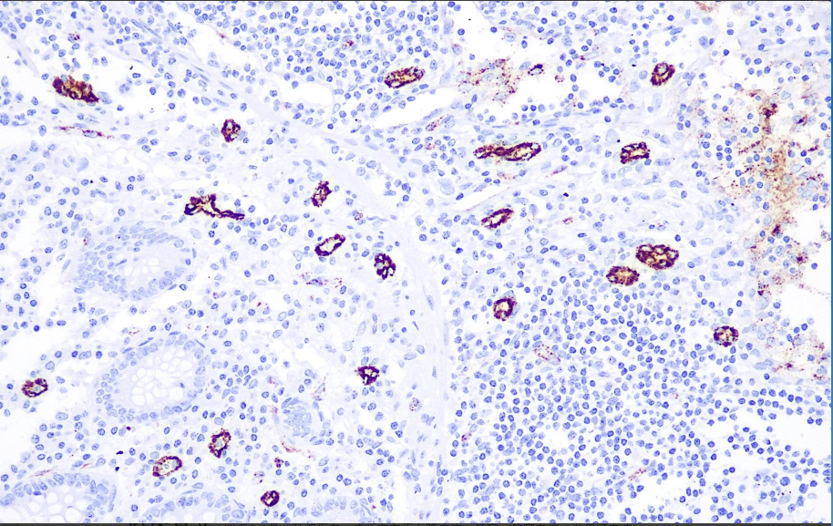 Ⅷ因子相关抗原存在于人的血管内皮细胞、巨核细胞和血小板。此抗体可以用于血管源性良性和恶性肿瘤的诊断,血管外皮细胞瘤常阴性表达。由于其也存在于正常的血浆和血小板中,在出血或血管损伤部位必有阳性着色,所以应注意区分。