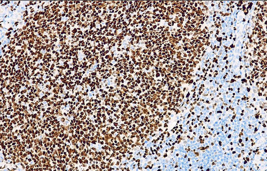 PU.1作为一个转录因子,属于Ets蛋白家族,在正常B细胞的发育过程中发挥重要作用。在骨髓细胞系及B细胞中表达,浆细胞不表达。 PU.1在B细胞的早期分化过程是必不可少的,若缺乏会使B细胞发育停滞在早前期。 PU.1在生发中心和套区B细胞中表达,同样在各种淋巴瘤中表达,其中包括:慢性B淋巴细胞白血病、套细胞淋巴瘤、滤泡性淋巴瘤、边缘区淋巴瘤、弥漫性大细胞淋巴瘤、弥漫性大B细胞淋巴瘤、结节性淋巴细胞霍奇金淋巴瘤。Torlakovic等人的研究表明在滤泡性淋巴瘤中生发中心抗原(包括PU.1)的高表达与总生存期和进展生存期有着可量化的正相关联系。