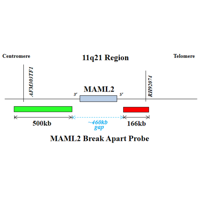 CRTC-MAML2融合也存在于肺、宫颈、甲状腺和口腔的粘液表皮样癌以及皮肤透明细胞汗腺癌中。尤其在肺粘液表皮样癌中,不伴有EGFR突变时,临床对吉非替尼敏感,提示了其可能与CRTC-MAML2有关,也为其他部分粘液表皮样癌的治疗提供了一种可能。MAML2基因断裂探针可用于粘液表皮样癌的辅助诊断。