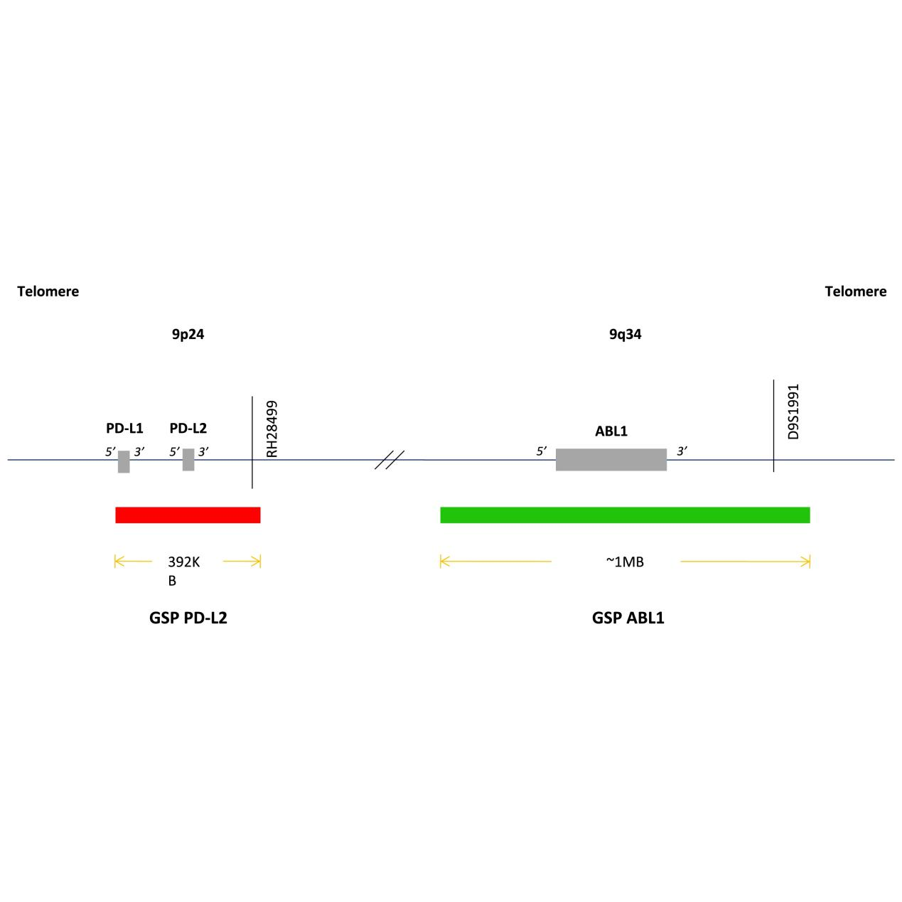 9p24.1区段扩增时结节硬化型霍奇金淋巴瘤的一种重现性基因异常。而在此区段上的编码PD-1配体蛋白的PD-L1和PD-L2基因(也分别称为CD274和PDCD1LG2)是9p24.1区段的重要靶标基因。PD-L2紧挨着PD-L1,可共用PD-L1扩增探针。