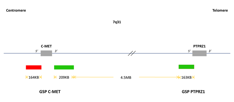 MET基因除了扩增/表达、第14外显子跳跃等突变外,还可发生融合。本探针可检测MET-PTPRZ1融合基因。