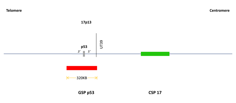 探针名称:杂交液I:CSP 17 / GSP p53;杂交液II:GSP ATM / GSP RB1;杂交液III:CSP 12 / GSP 13q14(D13S319)