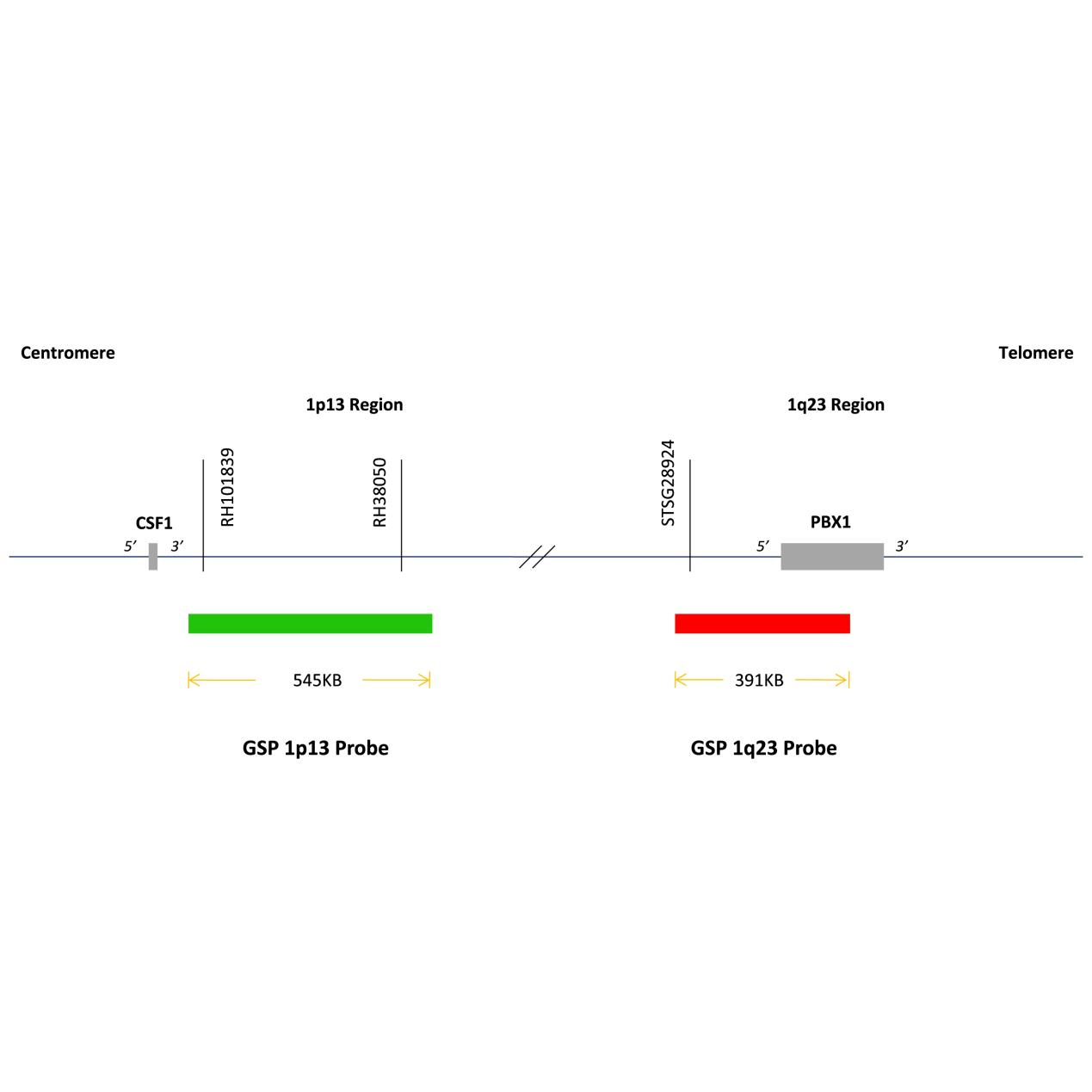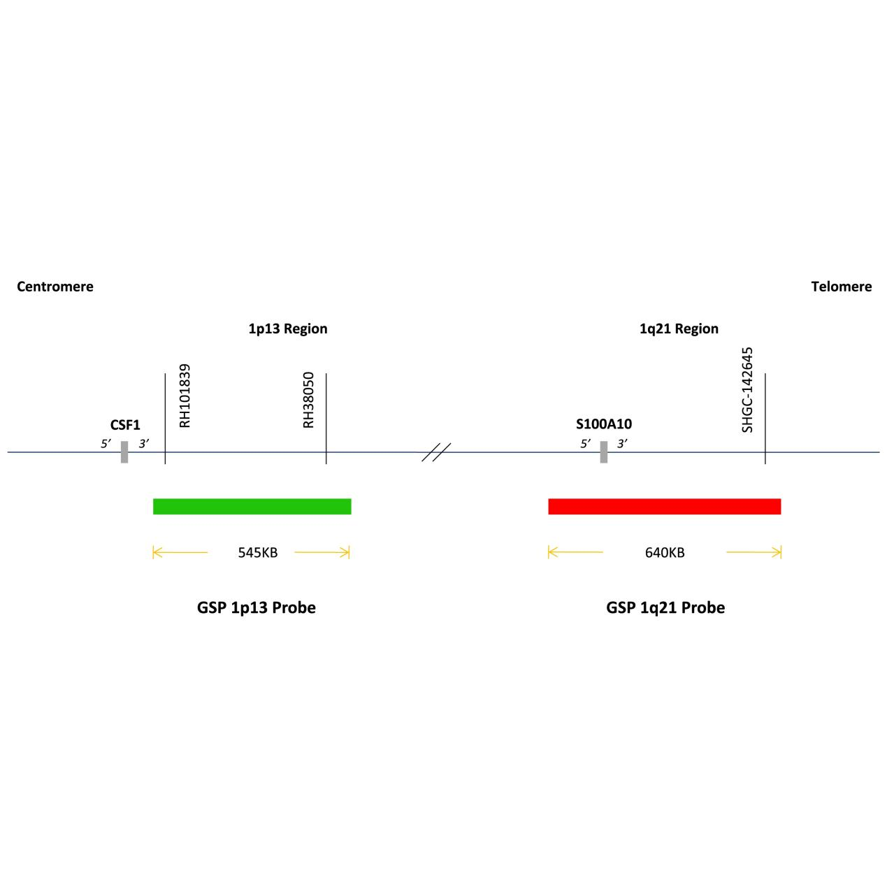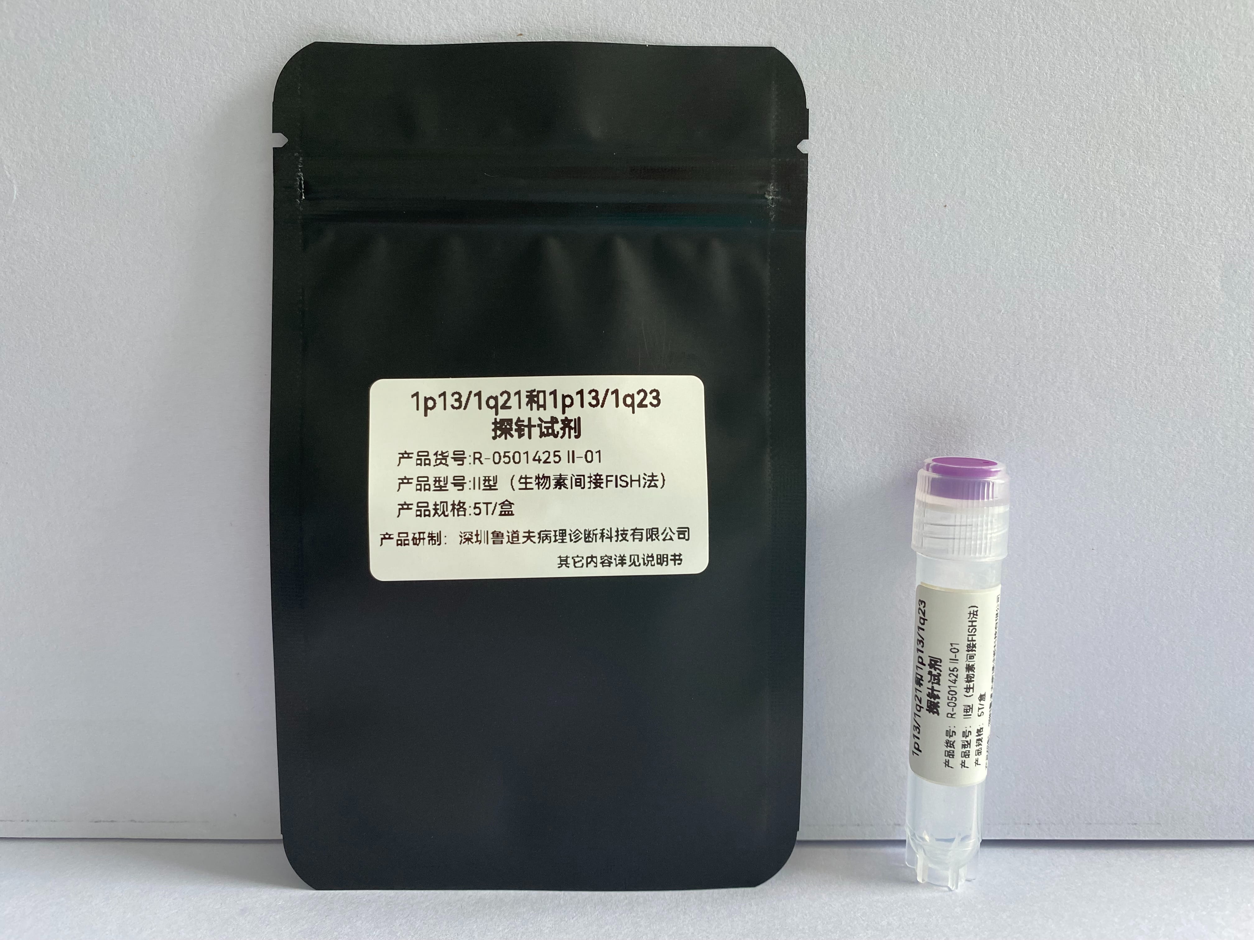 此探针可用于检测1q21及1q23数目异常,分成两管、分别搭配有1p13异臂内参。在肾母细胞瘤中,1p36缺失探针搭配的是1q21内参,但假如1q出现数目异常(获得或扩增,及缺失)的话会对1p36判读造成困扰。此探针设计成检测1q21及1q23的两个已有文献报道的异常区域,并以1p13为内参,可用于1p36探针中的1q21异常之后的复核。