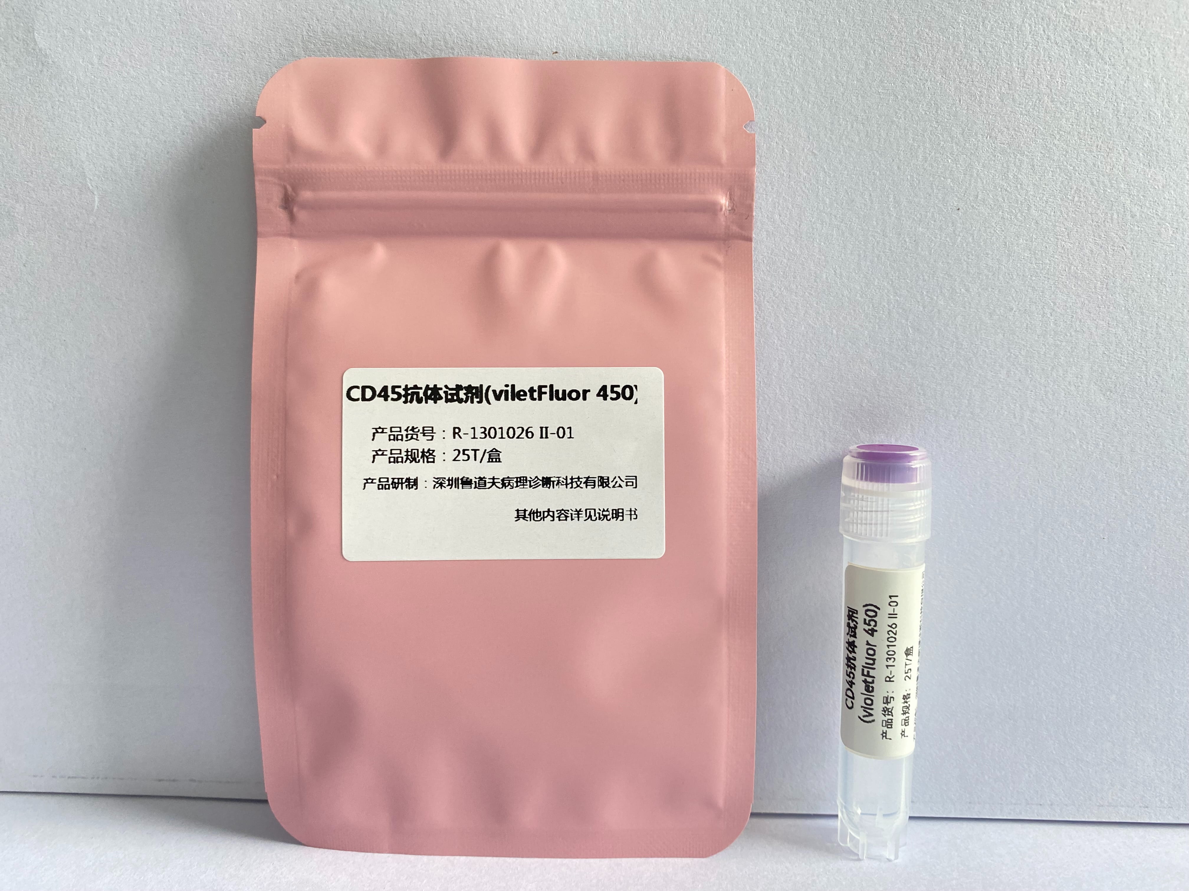 CD45也被称为白细胞共同抗原(leukocyte common antigen, LCA),由一类结构相似,分子量较大(180 kDa、190 kDa、205 kDa和200 kDa)的跨膜蛋白组成,广泛存在于所有白细胞表面(包括淋巴细胞、粒细胞和单核细胞),但不表达于成熟的红细胞、血小板、骨髓中的成熟红系细胞以及非造血组织。CD45胞浆区段具有蛋白质酪氨酸磷酸酶的作用,能使底物P56lck和P59fyn上酪氨酸脱磷酸而激活,在细胞的信息传导中发挥重要作用,CD45是细胞膜上信号传导的关键分子,在淋巴细胞的发育成熟,功能调节及信号传递中具有重要意义。CD45的分布可作为某些T细胞亚群的分类标志。