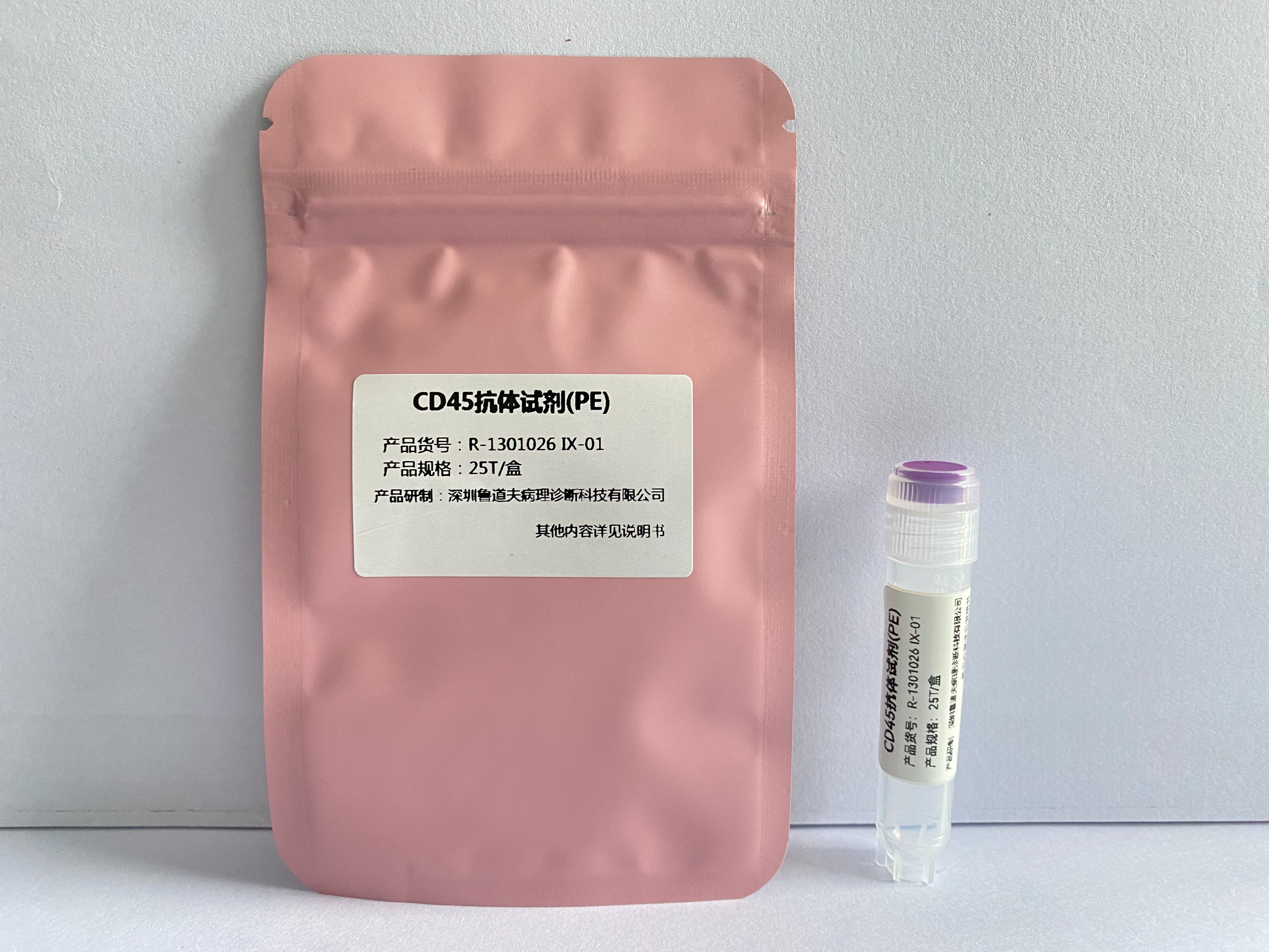 CD45也被称为白细胞共同抗原(leukocyte common antigen, LCA),由一类结构相似,分子量较大(180 kDa、190 kDa、205 kDa和200 kDa)的跨膜蛋白组成,广泛存在于所有白细胞表面(包括淋巴细胞、粒细胞和单核细胞),但不表达于成熟的红细胞、血小板、骨髓中的成熟红系细胞以及非造血组织。CD45胞浆区段具有蛋白质酪氨酸磷酸酶的作用,能使底物P56lck和P59fyn上酪氨酸脱磷酸而激活,在细胞的信息传导中发挥重要作用,CD45是细胞膜上信号传导的关键分子,在淋巴细胞的发育成熟,功能调节及信号传递中具有重要意义。CD45的分布可作为某些T细胞亚群的分类标志。