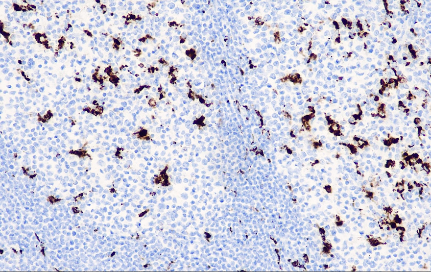 CD68 is a glycoprotein with a molecular weight of 110 kD that detects macrophages in human tissues, including Kupffer cells and macrophages in the spleen, intestinal lamina propria, alveoli, and bone marrow, and also labels bone marrow precursor cells and peripheral blood granulocytes and monocytes.