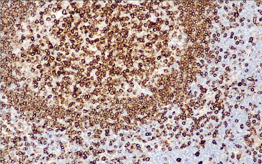 CD74 is expressed on all B-cells and certain T-cell subclasses (MHC II positive), mainly lymphocytes in germinal centers, with several isoforms (33-41 KDa), and is a constant chain of HLA-DR. This antibody is mainly used to label B cells and tumors of their origin, T cell lymphomas are rarely expressed, the staining pattern is cytosolic, but paranuclear granular staining is seen, which helps in the study of lymphomas and leukemias.