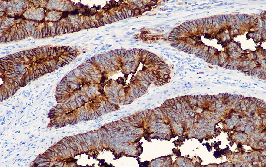Carcinoembryonic antigen is present in certain malignant tumor tissues, such as colon, lung, gastric and pancreatic cancers. This antibody specifically recognizes 180 kD carcinoembryonic antigen that is expressed in a restricted manner in the GI tract, and is primarily used to label epithelial tumors, especially adenocarcinomas of glandular epithelial origin, and is strongly positively expressed in gastrointestinal adenocarcinomas.