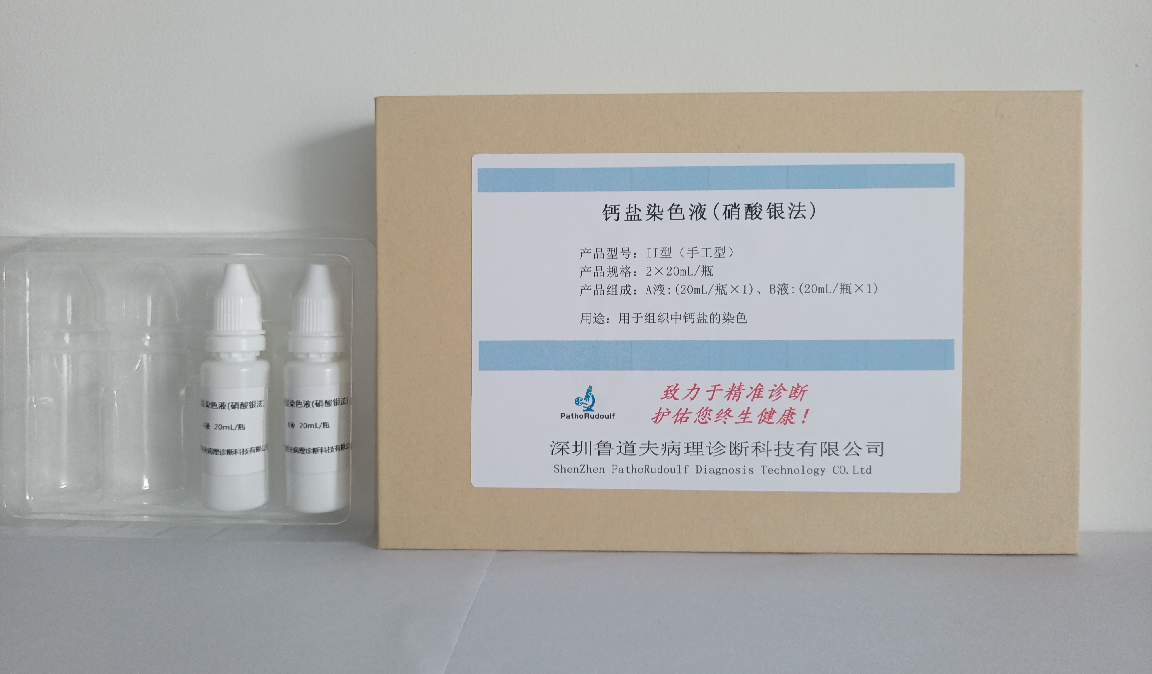 Calcium salt staining solution (silver nitrate method), is a metal replacement method, the principle lies in the Von Kossa silver solution on sections containing insoluble calcium salts, calcium is replaced by silver, silver salts in the role of light is reduced to black metallic silver, suitable for a large number of samples of calcium salt tissue staining.