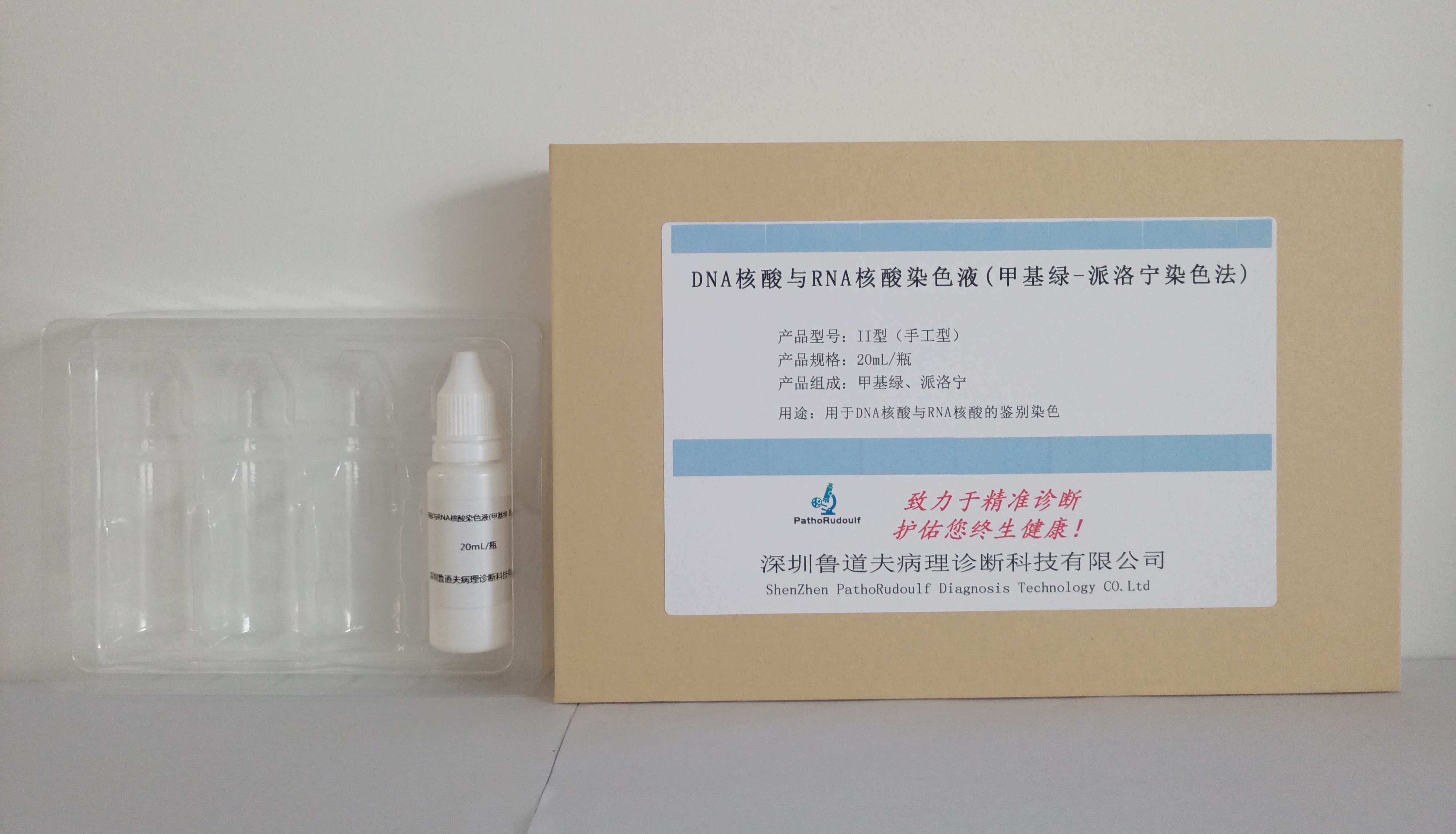 DNA nucleic acid and RNA nucleic acid staining solution (Methyl Green - Pyronin Staining Method) has been modified to be free of methanol, and stains the nucleus in tissue or cell staining, in which the methyl green has been purified to make it easier to stain, this staining solution can also be used with immunofluorescence staining or immunohistochemical staining, and 10 ml of the staining solution can stain up to 20 samples.