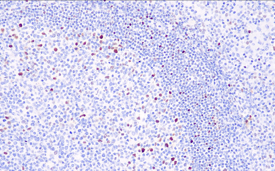 The c-Myc gene is an oncogene expressed in various cell types and is closely associated with the cell cycle. Studies have shown that 3% to 16% of diffuse large B-cell lymphoma and nearly 100% of Burkitt lymphoma exhibit MYC gene rearrangements. Immunohistochemical detection of MYC nuclear protein demonstrates high specificity and sensitivity in high-grade diffuse large B-cell lymphoma and Burkitt lymphoma. When used in combination with antibodies against CD10, BCL2, and Ki-67, the results show high consistency with FISH testing.