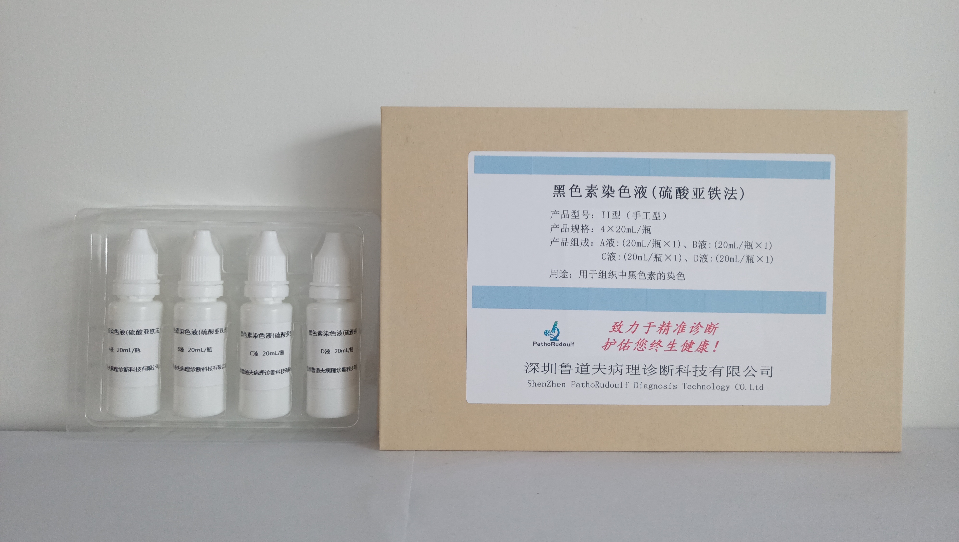 Melanin staining solution (ferrous sulfate method) uses melanin to take up ferrous ions to form melanin ferrous complex, and then combines with potassium ferricyanide to produce blue ferrous ferricyanide under acidic environment, i.e. Teng's blue reaction, ferrous sulfate method is also known as ferrous ion uptake method, the staining solution is suitable for paraffin sections, and fixation is better by using formalin and should not be used in chromate fixation solution.