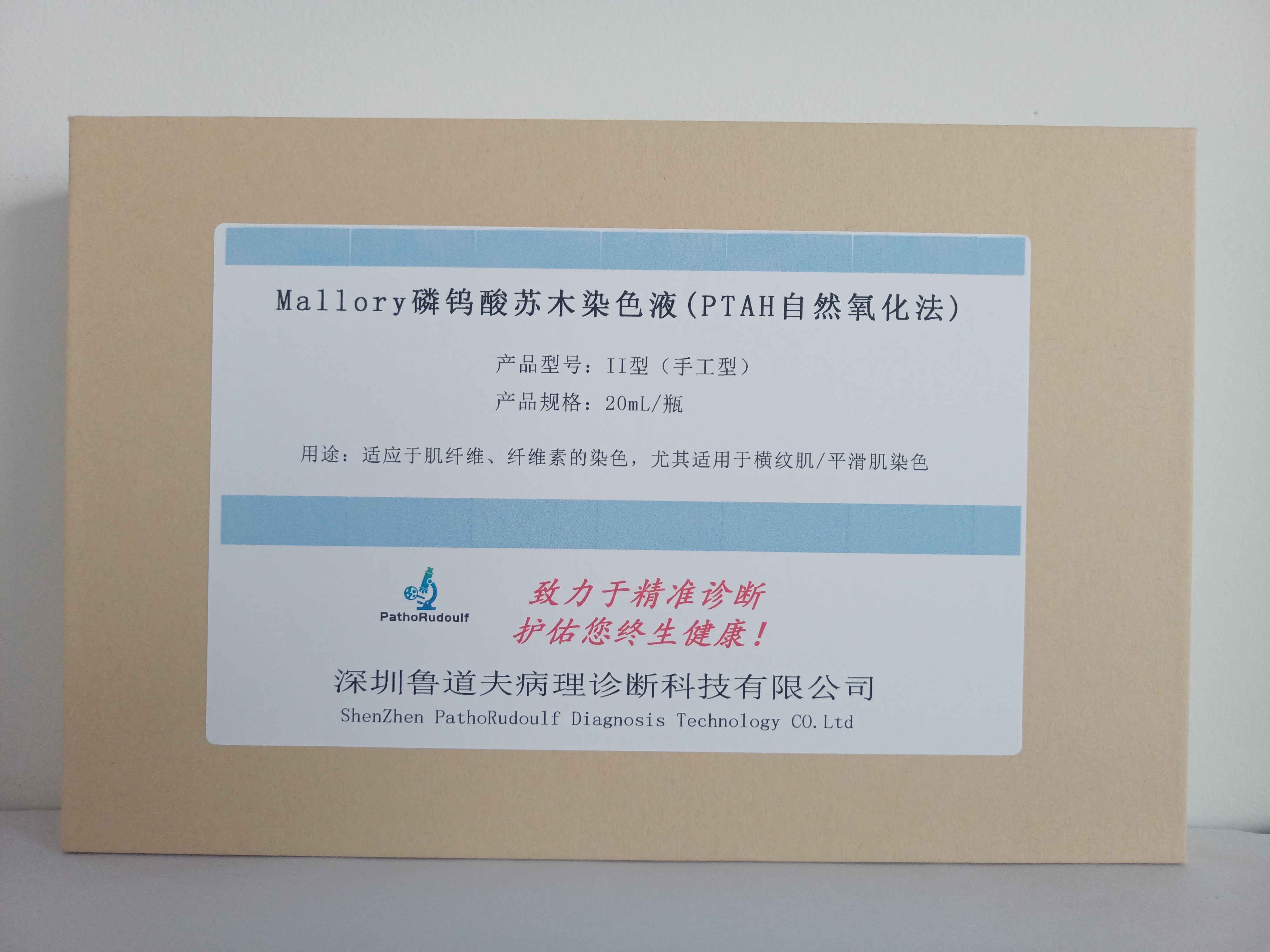 Mallory phosphotungstic acid hematoxylin staining solution (PTAH natural oxidation method) mainly consists of PTAH oxidizing agent, oxalic acid solution, and Mallory PTAH staining solution. Mallory PTAH staining solution is a naturally matured staining solution, with better staining power and long preservation time, and is mostly used to show the transverse striations of the transverse myocardium, which is clinically applied to the diagnosis of rhabdomyosarcoma. The histological morphology of rhabdomyosarcoma is varied, and it is difficult to distinguish it from undifferentiated mesenchymal tumors, after using phosphotungstic acid hematoxylin staining, if blue transverse stripes are found in the cytoplasm of tumor cells, it can be proved that the tumor is showing rhabdomyosarcoma differentiation, and this staining solution can also be stained for the fibrils of inflammation exudation, fibrils in capillaries of DIC, and the neuropathology, and other aspects.
