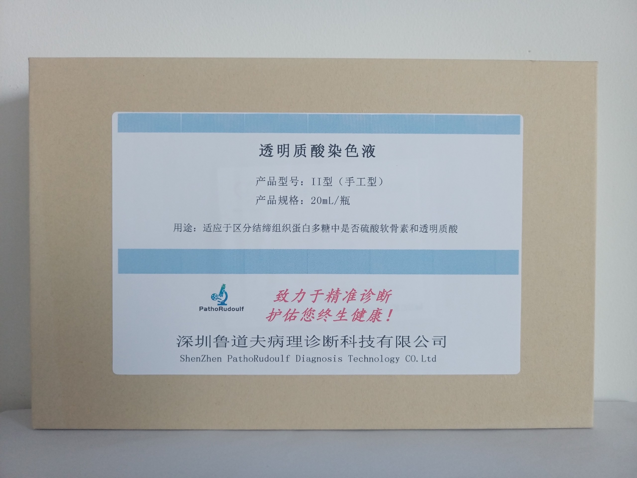 The hyaluronic acid staining solution was cleaved by hyaluronidase and combined with Alisin blue staining, which was based on the principle that the glycosidic bond in hyaluronic acid and chondroitin sulfate could be cleaved by hyaluronidase, and the specimen was pretreated with hyaluronidase before staining with Alisin blue. Compared with untreated sections, the presence of hyaluronan or chondroitin sulfate in the tissue was indicated if the treated sections did not stain, and the absence of hyaluronan in the tissue if the pretreatment had no effect. Although lacking specificity, remaining negative after hyaluronidase treatment can rule out the presence of hyaluronic acid.