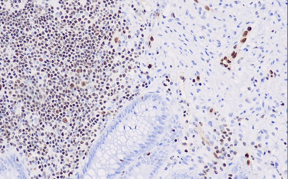 The FLI-1 gene and FLI-1 protein are recognized for their important role in the pathogenesis of Ewing sarcoma/peripheral neuroblastoma (ES/PNET). FLI-1 was initially applied to the study of Ewing sarcoma/peripheral primitive neuroectodermal tumors, demonstrating superior specificity and sensitivity compared to CD99. Recent studies have confirmed that the FLI-1 gene also plays an important role in the embryonic development of blood vessels, with expression observed in endothelial cells of various types of human vascular structures (arteries, veins, and lymphatic vessels), achieving a positivity rate of up to 90% in angiosarcomas; it is also expressed in lymphoblastic lymphoma. This antibody is now recommended for use in combination with CD99 to identify Ewing's sarcoma/peripheral neuroectodermal tumor (ES/PNET); it is also used in the study of vascular endothelial tumors, particularly in distinguishing between epithelial-like vascular endothelial tumors and epithelial tumors.