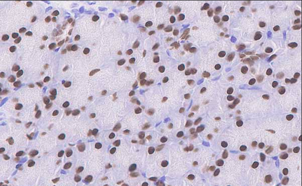 FOX A1, also known as hepatocyte nuclear factor 3α (HNF3α), is a transcription factor expressed in normal breast ductal epithelium, as well as in epithelium of the lung, pancreas, bladder, prostate, and colon. FOX A1 has been reported to be co-expressed with ER in breast cancers, especially ductal A breast cancers (83%, including those with ER+/PR+/HER2+ cases), and in 42-45% of breast invasive carcinoma cases, while 86% of basal-like triple-negative breast cancers are negatively expressed. Thus, FOX A1 may be a useful indicator for breast cancer staging.