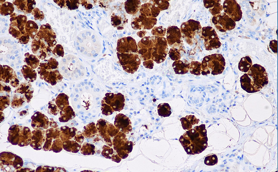 GCDFP-15 is a 15 kD single-chain protein commonly found in the vesicular fluid of cystic vesicle disease.GCDFP-15 is a highly specific and sensitive breast cancer marker, positively expressed in 50% to 60% of primary breast cancers.In combination with CK7 and CK20, it can be used to identify primary (positively expressed) or secondary extra-mammary Paget's (Paget) disease (negatively expressed).