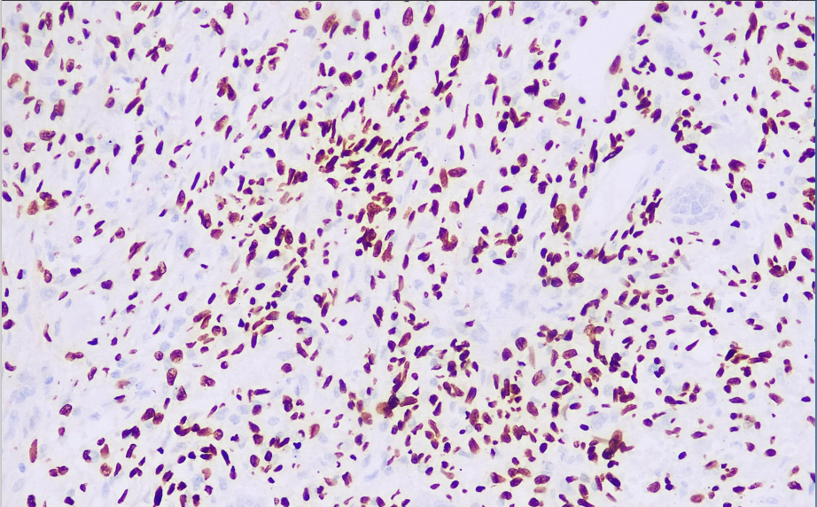 Giant cell tumor of bone (GCTB) is a locally aggressive joint tumor. Research has found that the expression rate of H3.3G34W in GCTB reaches 97.8%. The H3F3A (H3.3) gene mutation includes a glycine 34 substitution, with an incidence rate of up to 96% in GCTB, with most being the p.G34W mutation type, and only a few being G34L, V, or M mutation types. The H3.3G34W antibody exhibits high specificity and sensitivity toward tumors harboring such mutations, making it an highly effective GCTB biomarker.