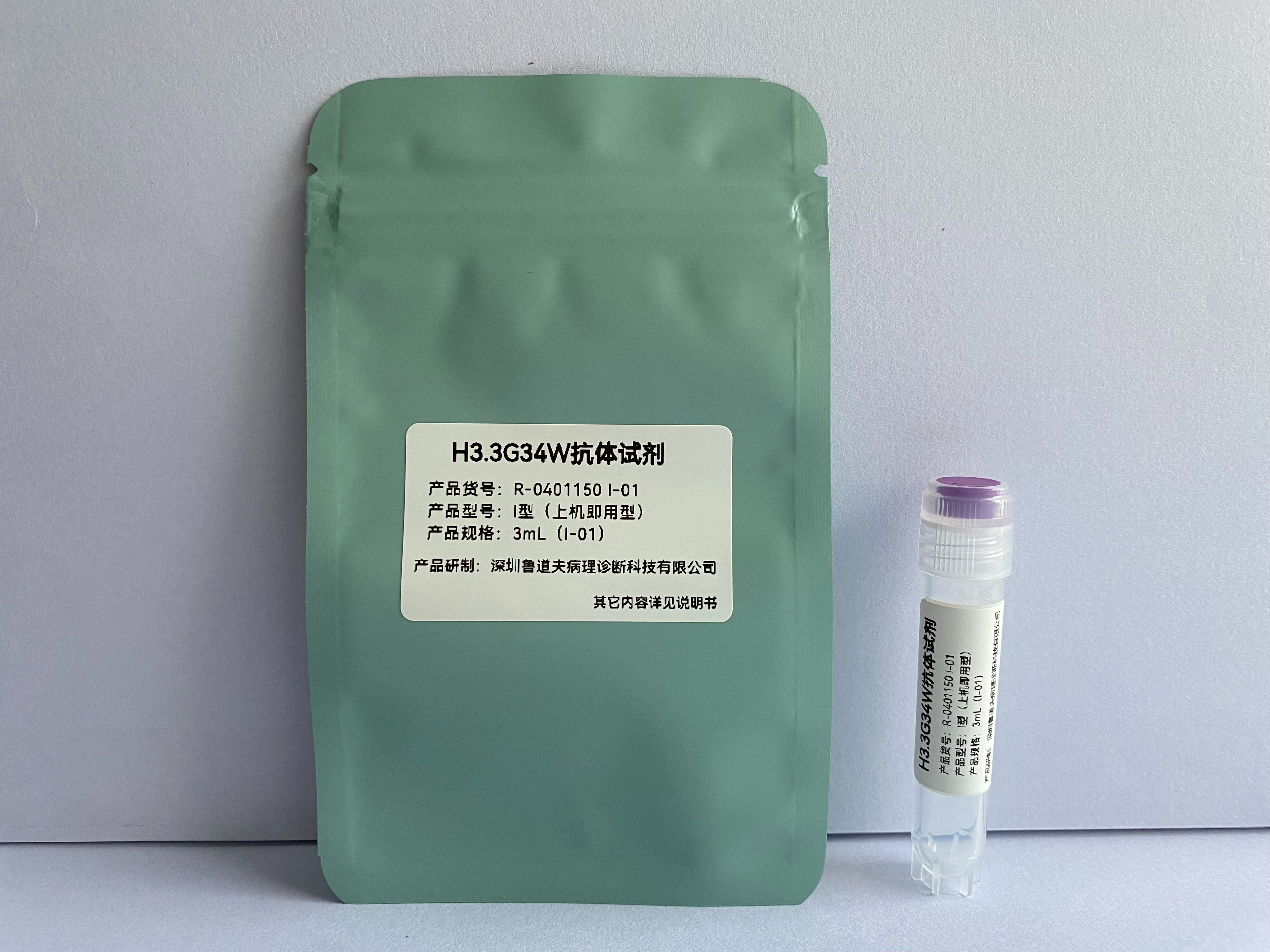 The H3.3G34W antibody reagent specifically binds to the H3.3G34W molecular antigen. The immunohistochemistry kit containing the H3.3G34W antibody reagent is suitable for the precise diagnosis of giant cell tumor of bone (GCTB) and certain high-grade gliomas in children (such as H3.3G34 mutation types).