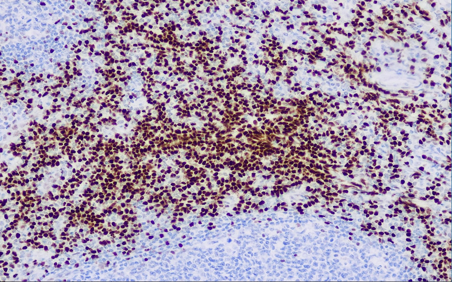 LEF-1(Lymphoid Enhancer-binding Factor 1) : Lymphoid enhancer-binding factor 1, as a key transcription factor in the Wnt/β-catenin signaling pathway, regulates cell proliferation and survival. LEF-1 plays an important role in lymphocyte proliferation and is normally expressed in T cells and pre-B cells, but not in mature B cells. LEF-1 is a new biomarker for chronic lymphocytic leukemia/small lymphocytic lymphoma (CLL/SLL), but it is not a specific lymphocyte biomarker. It can be used to study CLL/SLL (especially when CD5 is negative and CD23 is difficult to interpret), and is also helpful in detecting tiny infiltration of CLL in the bone marrow.