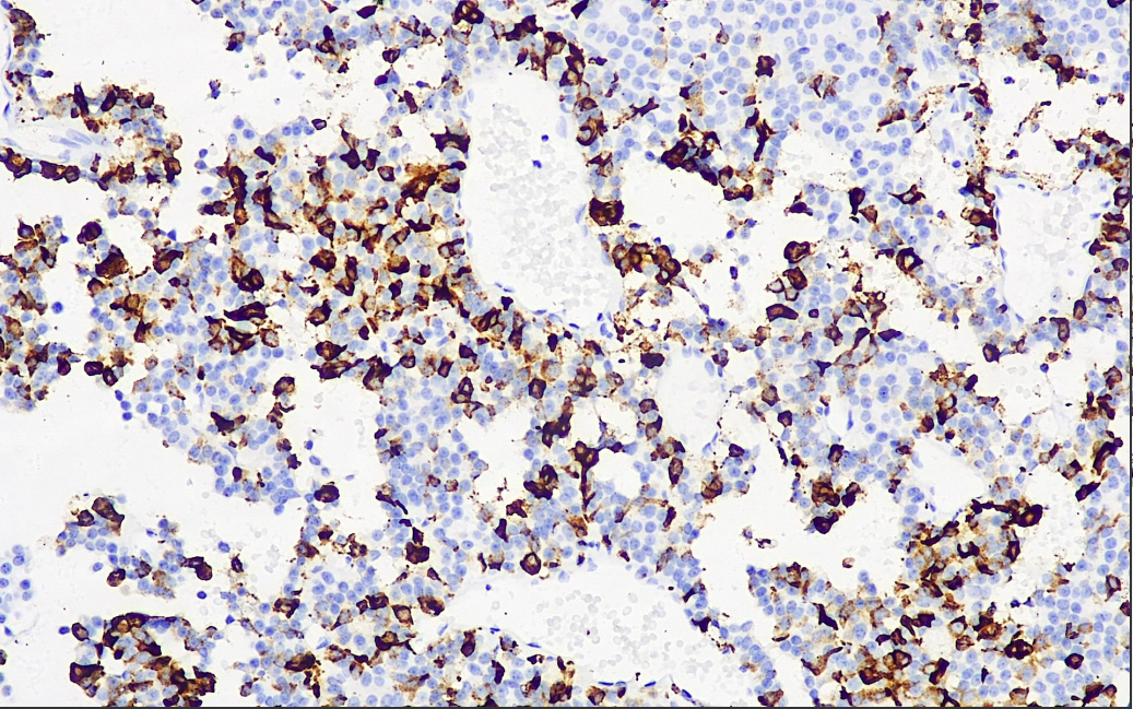 ACTH is a hormone secreted by anterior pituitary cells. This antibody reacts with human ACTH and also cross-reacts with ACTH from a variety of mammals. It can be used to functionally classify pituitary adenomas, and can be used in studies to differentiate between primary and metastatic pituitary tumors. Some neuroendocrine tumors, such as pheochromocytoma, may also show a positive reaction.