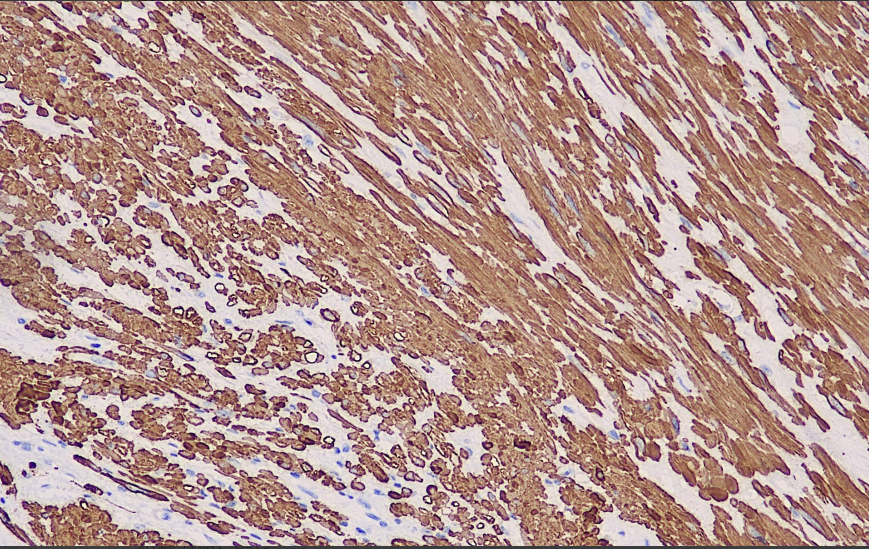 Actin is a microfilament protein with the ability to contract and is a major component of the myocyte cytoskeleton. Actin can be classified into three types according to its isoelectric point from low to high: alpha, beta, and gamma.MSA recognizes alpha actin and gamma actin in skeletal, cardiac, and smooth muscle. It can be used in the study of skeletal, cardiac and smooth muscle and tumors of their origin. Non-muscle cells such as vascular endothelial cells and connective tissue do not react with it. Therefore, tumors of non-muscle origin such as epithelial tumors, melanomas, and lymphomas are negatively tabulated for this antibody.