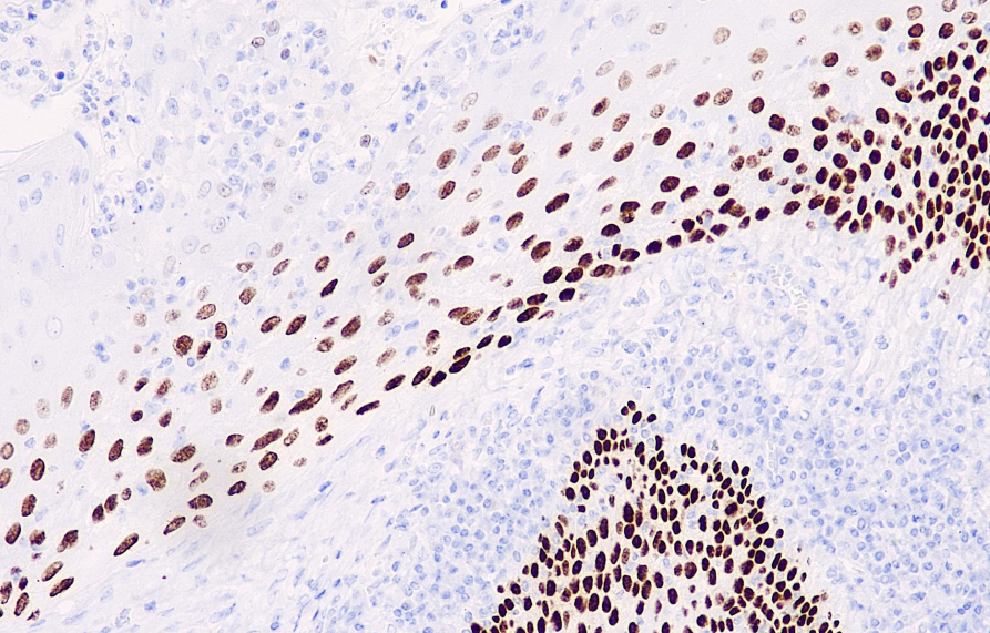 p63 is a homologous gene of the tumor suppressor gene p53, located on chromosome 3q27-28, encoding more than six isomers, which respectively possess transcriptional kinase activity, death induction activity (TAP63), and chromogenic inactivation activity. It is highly expressed in the basal layer of many epithelial tissues. It is expressed in myoepithelial cells of all normal mammary glands, partially in ductal proliferative cells, and in very small amounts in breast cancer in situ. It is not expressed in invasive ductal carcinoma. The absence of p63 expression may have a certain correlation with the progression of ductal carcinoma of the breast. Therefore, p63 immunohistochemical staining is helpful for the study of invasive ductal carcinoma of the breast, ductal carcinoma in situ, and a small number of suspected ductal hyperplastic injuries and other diseases. Recent studies have shown that p63 serves as a reference for prostate basal cells, but it is not expressed in the vast majority of prostate tumors. This antibody is mainly used in the research of benign and malignant lesions of the breast and prostate.