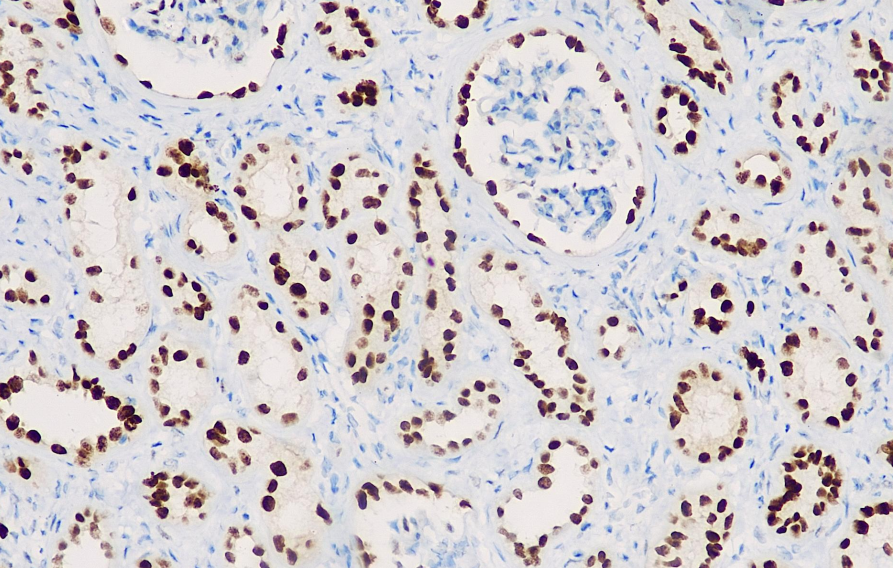 Pax-8 is one of the members of the pairing box family of nuclear transcription regulators and is a nuclear protein. It is expressed in the follicular cells of the thyroid gland, the kidneys and the organogenesis of the Lerian duct. PAX8 is expressed in serous cell carcinoma, endometrioid cell carcinoma and clear cell carcinoma of the ovary, but is almost non-expressed in mucinous cell carcinoma of the ovary. PAX8 is expressed in 98% of clear cell renal cell carcinomas, 90% of papillary cell carcinomas and 95% of eosinophilic cell tumors. Its expression frequency in renal tumors is similar to that of PAX2. Therefore, PAX8 has once again become one of the reference bases for renal tumors.