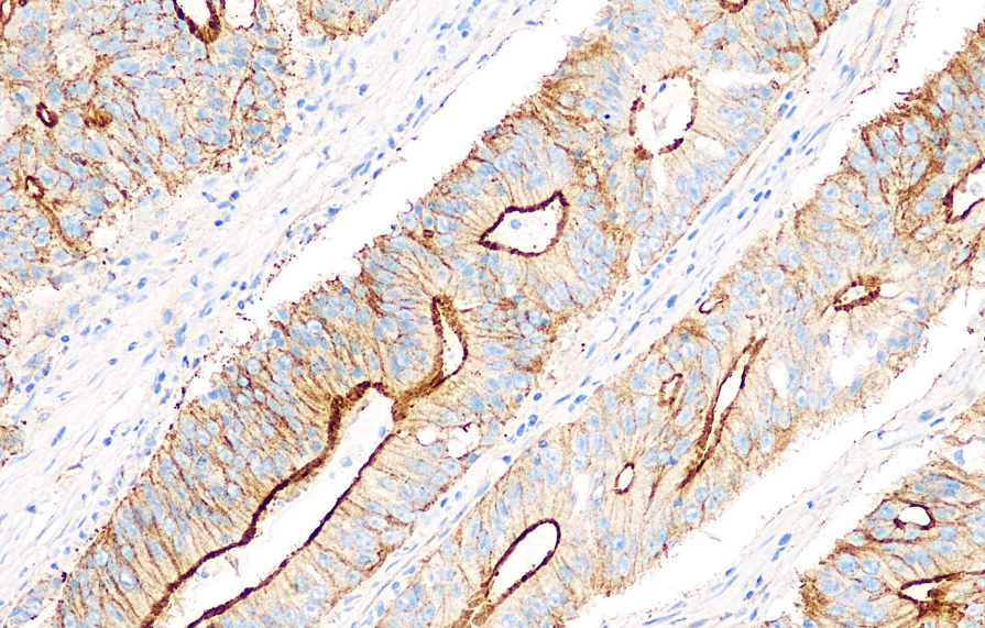 P-glycoprotein is a membrane-bound glycoprotein encoded by the MDR gene, with a molecular weight of 170–180 kDa. It belongs to the ABC (ATP-binding cassette) superfamily of membrane transport proteins and can rapidly pump cytotoxic drugs out of the cell using ATP as an energy source. Its expression level is associated with cell membrane permeability, intracellular drug concentration, and the degree of drug resistance. High expression of P-glycoprotein in tumor cells indicates that the tumor has developed resistance to certain lipophilic drugs, which has reference significance for chemotherapy.