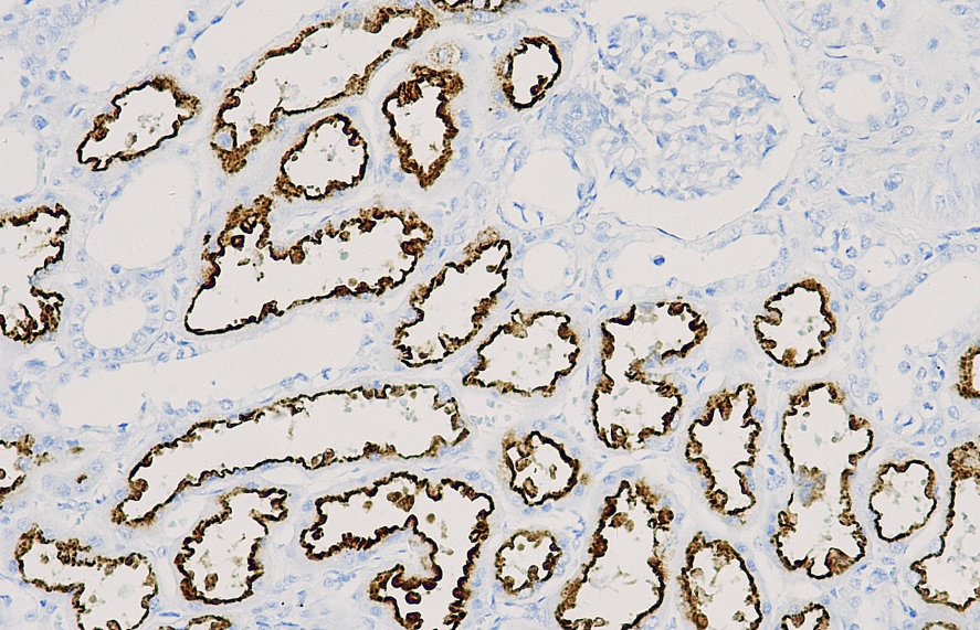 RCC is positively expressed in more than 90% of primary renal cell carcinomas and approximately 80% of metastatic renal cell carcinomas. It can be used in combination with CD10 for the differential diagnosis of metastatic renal cell carcinoma. RCC is also expressed on the luminal surface of breast acinar and ductal epithelial cells, epididymal epithelial cells, and the main cells of the parathyroid gland, as well as in the colloid of thyroid follicles.
