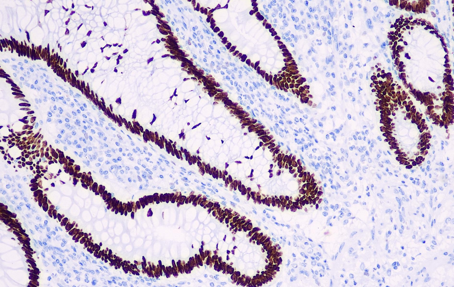 DNA-binding protein SATB2, also known as specific AT sequence-binding protein 2, is a nuclear matrix-associated transcription factor. In normal tissues, SATB2 exhibits strong nuclear expression in glandular cells of the gastrointestinal tract, including the appendix, colon, and rectum. SATB2 is also expressed in certain neurons of the cerebral cortex and hippocampus. In tumor tissues, SATB2 can be detected in cancer cells derived from the colon and rectum, making it a useful marker for colorectal cancer. Numerous studies have shown that SATB2 exhibits high sensitivity (85%) for colorectal cancer. Recent research indicates that SATB2 is expressed in 89% of colorectal adenocarcinomas. Additionally, SATB2 has been proposed as a valuable prognostic marker.