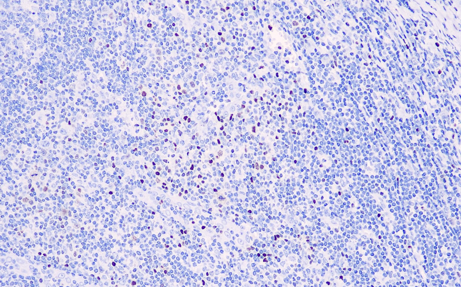 T-bet transcription factor is expressed in CD4-positive T lymphocytes and plays a crucial role in the differentiation of immature T helper precursor cells (Thp) into T helper 1 (Th1) cells and the re-differentiation of Th2 cells into Th1 cells. T-bet serves as a reference marker for mature T cells, with minimal expression in Thp and no expression in precursor T-cell leukemia. In reactive lymphoid tissues such as tonsils, lymph nodes, and spleen, T-bet is positively expressed in dispersed small lymphocytes in the follicular zone of T-cell areas, while no expression is observed in the germinal center, perifollicular zone, or marginal zone. T-bet is expressed in B-cell lymphoproliferative disorders, particularly during early B-cell development, including precursor B-cell lymphoblastic leukemia, mature B-cell lymphoma (including chronic lymphocytic leukemia and small lymphocytic leukemia), marginal zone lymphoma, and hairy cell leukemia. Conversely, B-cell lymphomas originating from the pre-germinal center and germinal center are T-bet-negative, including mantle cell lymphoma, follicular lymphoma, diffuse large B-cell lymphoma, and Burkitt lymphoma. Therefore, T-bet can serve as a reference for classifying B-cell and T-cell proliferative disorders.
