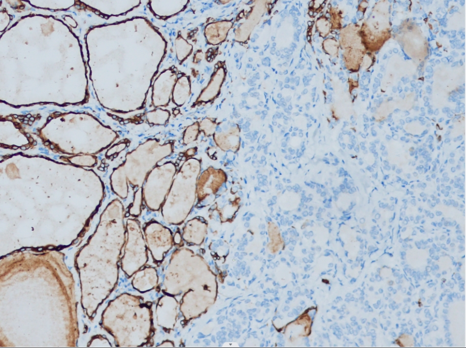 Thyroid peroxidase (TPO) is located on the apical free surface of thyroid epithelial cells and directly participates in the oxidation of iodine, the iodination of tyrosine, and the coupling of iodinated tyrosine in thyroid cells. It is a key enzyme in the synthesis of thyroid hormones. It is highly expressed in normal, hyperplastic, and most benign thyroid tissues, but its expression is significantly reduced in malignant thyroid tumors. Therefore, this antibody can be applied to the study of benign and malignant thyroid tumors.