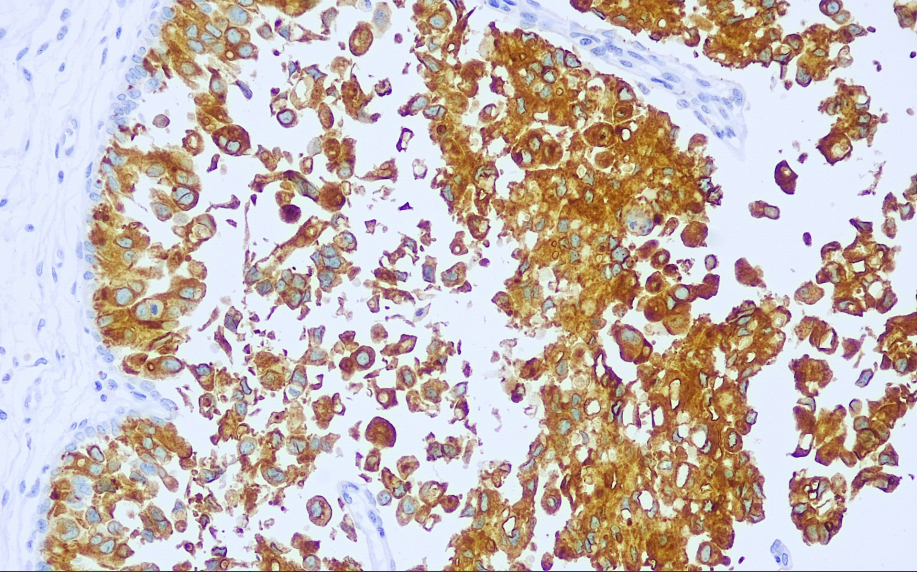 Roplakins (UPs) are a family of transmembrane proteins involved in the differentiation of bladder epithelial cells, comprising four types: Ia, Ib, II, and III. In non-tumorous urinary tract epithelium, they are expressed in the luminal surface of the superficial layer in the form of 16-nm particles. Studies have shown that these four glycoproteins are exclusively present in urothelial transitional epithelium and are virtually absent in other tissues. The expression of uroplakins in bladder transitional cell carcinoma is correlated with the degree of differentiation of bladder cancer, with higher expression levels observed in more differentiated tumors. Uroplakin II, as a highly specific antibody, is highly useful in the differential diagnosis of tumors of urothelial origin.
