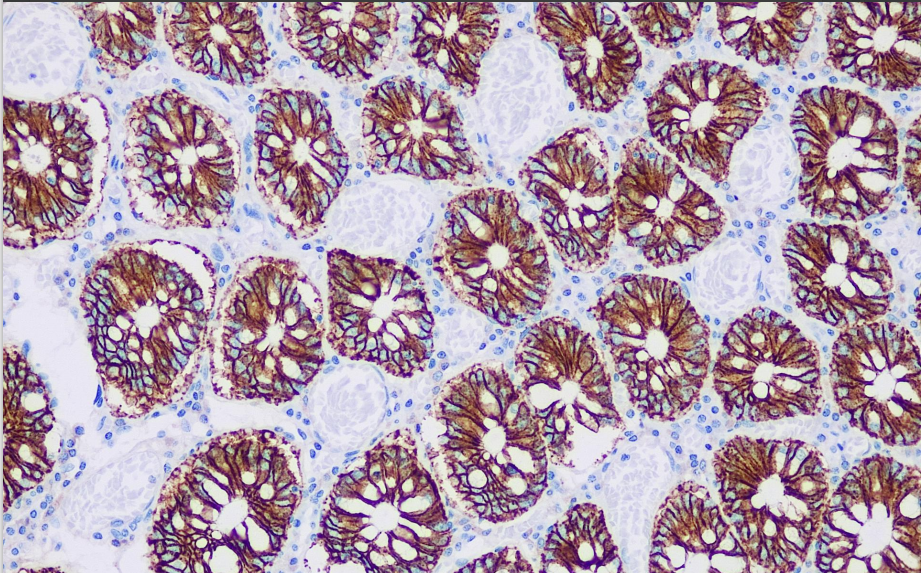 Ll-cadherin (Cadherin 17, CDH17), also known as liver-intestinal cadherin, belongs to the cadherin superfamily and mediates cell-cell adhesion and intestinal peptide transport. It has seven cadherin repeat domains in the extracellular region, while the intracellular domain contains only 20 amino acid residues and lacks interaction with other intracellular proteins. It is primarily expressed in the appendix, colon, and small intestinal epithelium, with minimal expression in other normal tissues. Studies have shown that Cadherin 17 can be used for the diagnosis and differential diagnosis of intestinal adenocarcinoma. It exhibits diffuse strong expression in colorectal adenocarcinoma, while gastric adenocarcinoma, pancreatic cancer, and cholangiocarcinoma show only focal or scattered expression. It has a high positive rate in posterior renal adenomas, but is negatively expressed in epithelial-predominant Wilms' tumor and solid papillary renal cell carcinoma. Primary bladder adenocarcinoma also has a high positive rate, while urothelial carcinoma with adenoid differentiation is negative, aiding in differential diagnosis. CDH17 can be used to diagnose early Barrett's esophagus, and overexpression of CDH17 in ovarian epithelial carcinoma indicates poor prognosis.
