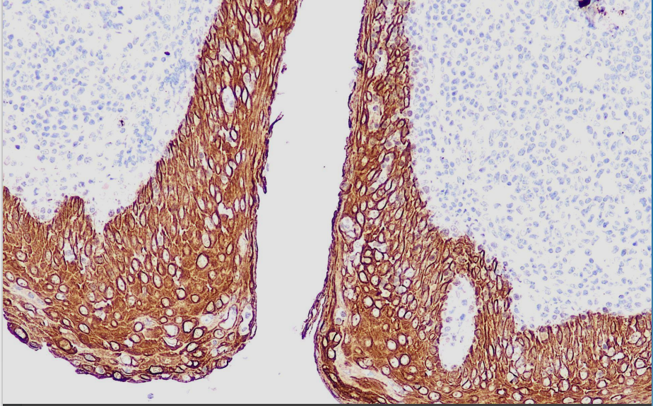 Cytokeratin HMW AE3 is a high molecular weight keratin antibody that recognizes all basic keratins and marks most epithelial and epithelial-derived tumors.