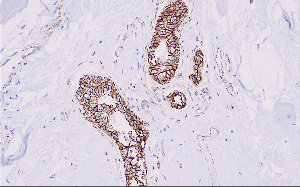 Beta-catenin's is a protein with a molecular weight of 92 kDa that is normally found in the cytoplasm beneath the membrane and is functionally linked to E-Cadherin. Mutations in the gene for this protein result in accumulation of the protein in the nucleus. In fibromatosis lesions of the breast and abdomen, colorectal cancer, and colorectal cancer, β-catenin can be found in the nucleus of the diseased cells, which helps to differentiate it from other spindle cell lesions occurring in these locations.