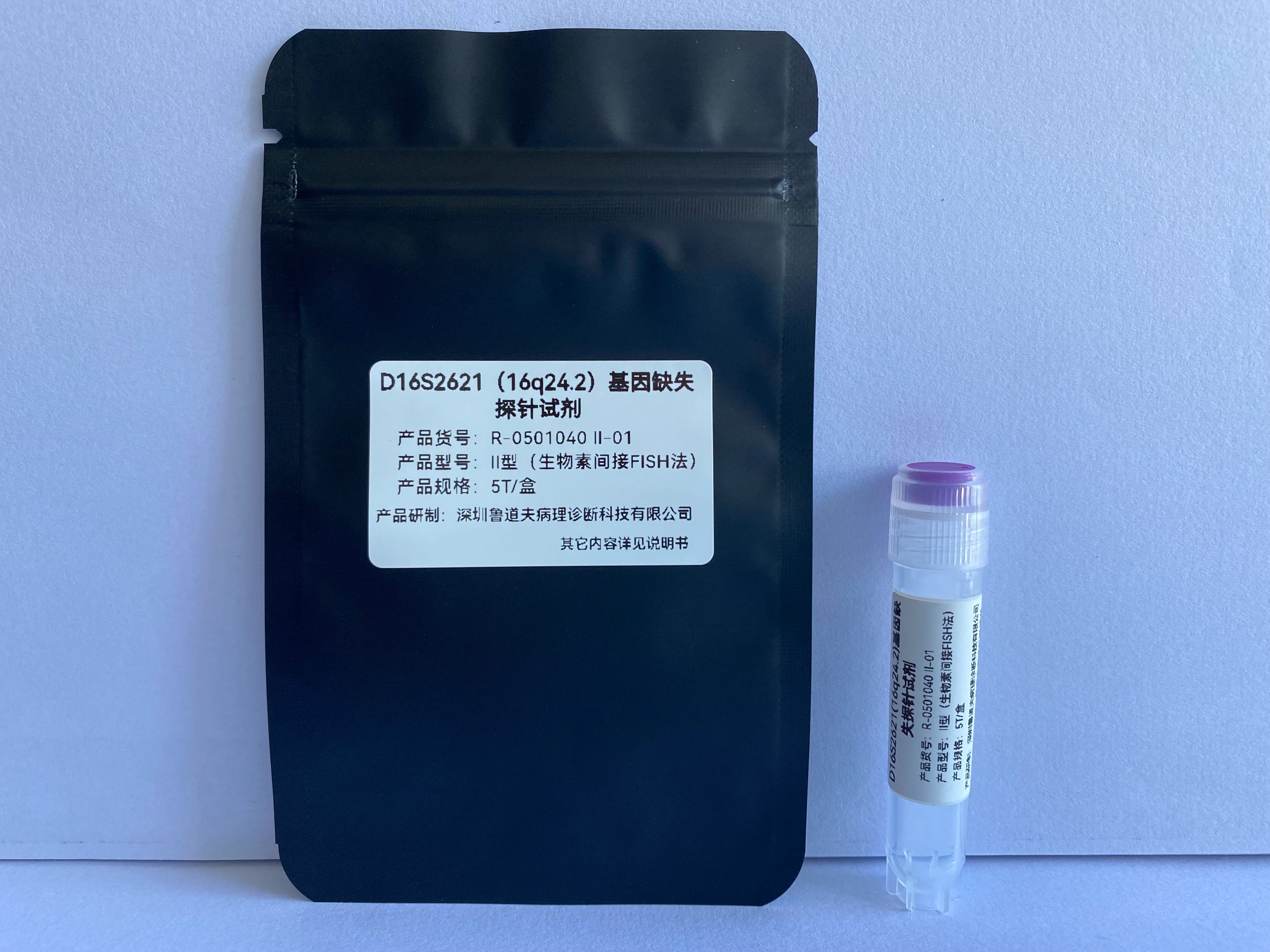 This probe contains a 16q telomere internal control and is used for detecting 16q deletions in Wilms' tumor, which are associated with poor prognosis. Since the range of 16q deletions in Wilms' tumor is quite broad, our company has employed probes targeting the 16q22 and 16q23 loci, each paired with a 16q telomere internal control for detection. However, in a small number of cases, there is a possibility of deletion occurring only in the most distal chromosomal segment of 16q. Therefore, the D16S2621 probe was designed to be as close as possible to the chromosomal end, serving as an effective supplement to the F.01345 16q22/16q23 probe.