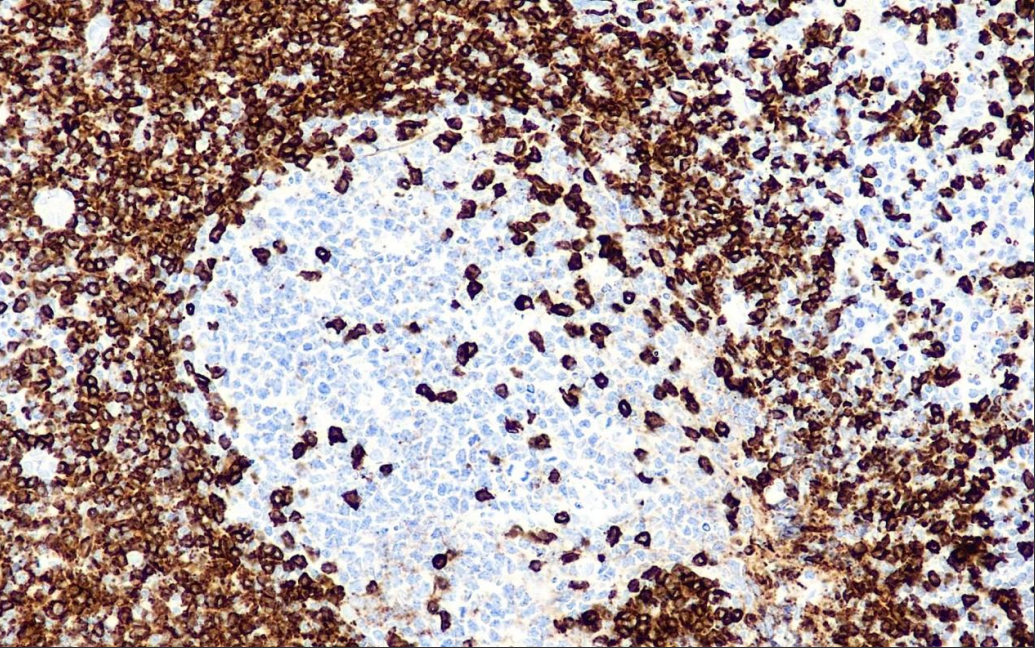 The CD3 molecule is a complex molecule consisting of five peptide chains bonded non-covalently and is expressed on the surface of so mature T cells. It is positively expressed in greater than 95% of T-cell or NK-cell lymphomas and shows strong positivity in the perinuclear region, often overlying nuclear folds. It is currently the T cell marker of choice.