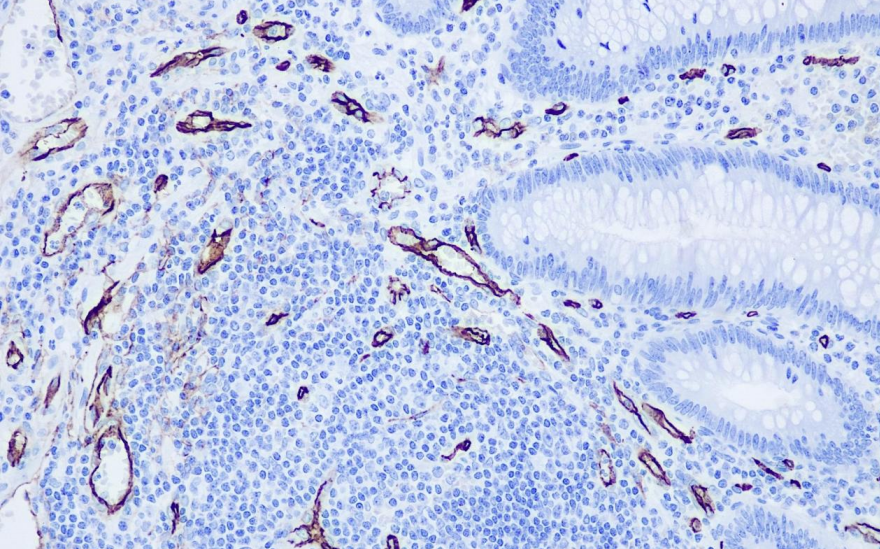 CD34 is a single-chain membrane-penetrating protein with a molecular weight of 110 kD, expressed in early lymphoid hematopoietic stem cells, progenitor cells, vascular endothelial cells, embryonic fibroblasts, and cells of certain neural tissues. It is mainly used in the diagnosis and differential diagnosis of benign/malignant tumors of vascular origin, as well as the diagnosis of gastrointestinal mesenchymal tumors in combination with CD117 and DOG-1.