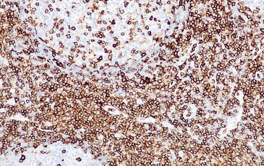 CD43 is a transmembrane glycoprotein expressed on the membrane surface of normal and tumorigenic T cells. It can label most T-cell lymphomas, but about 30% of B-cell lymphomas are also positive, so this antibody is usually used in combination with antibodies labeling T and B cells to aid in the diagnosis of T-cell lymphomas.